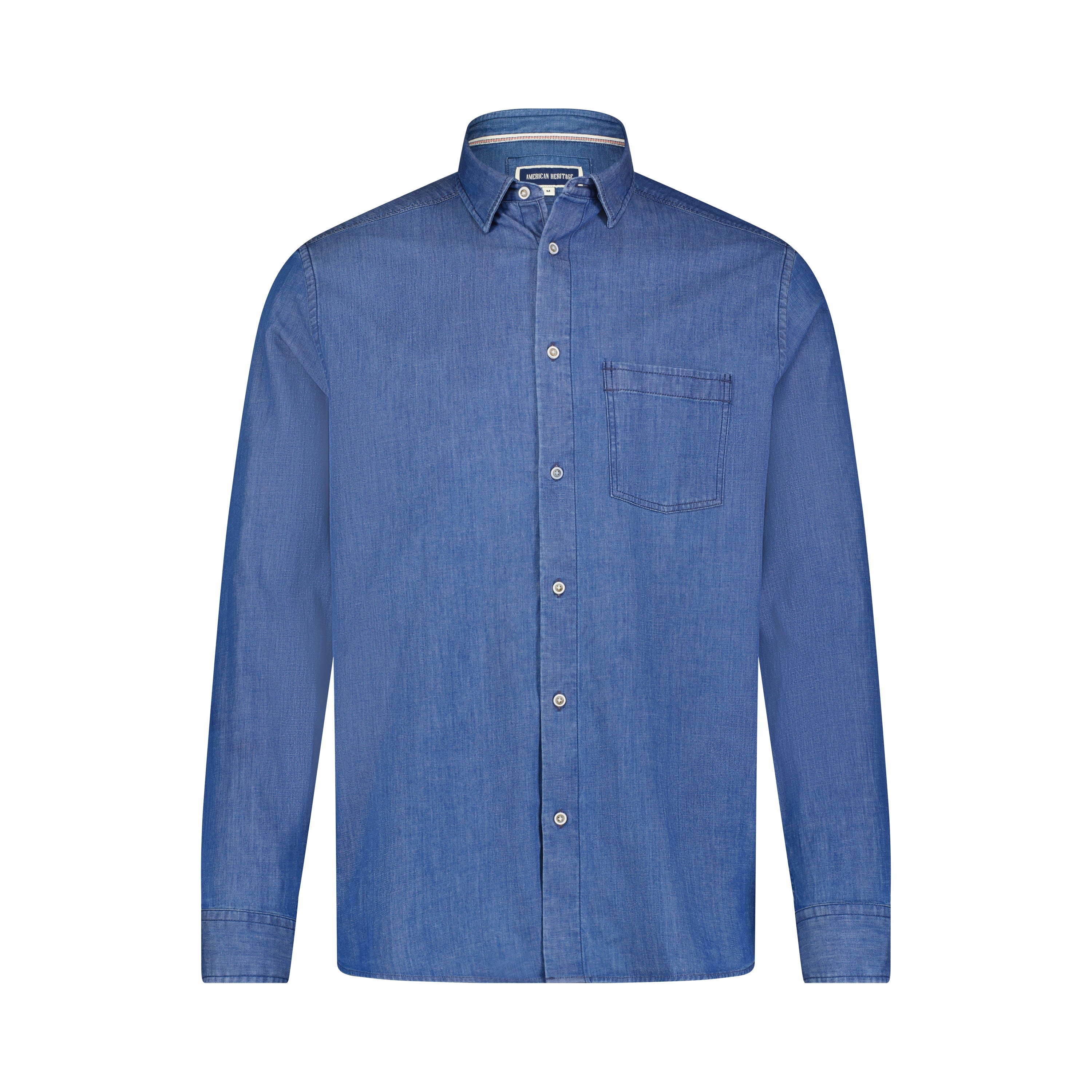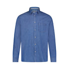 The Blue Denim Stretch Long Sleeve Shirt offers American Heritage comfort fit, complete with an inner ribbon collar for added support. Crafted from organic cotton blended with modal for optimal softness, it is easy to care for and wear.