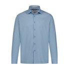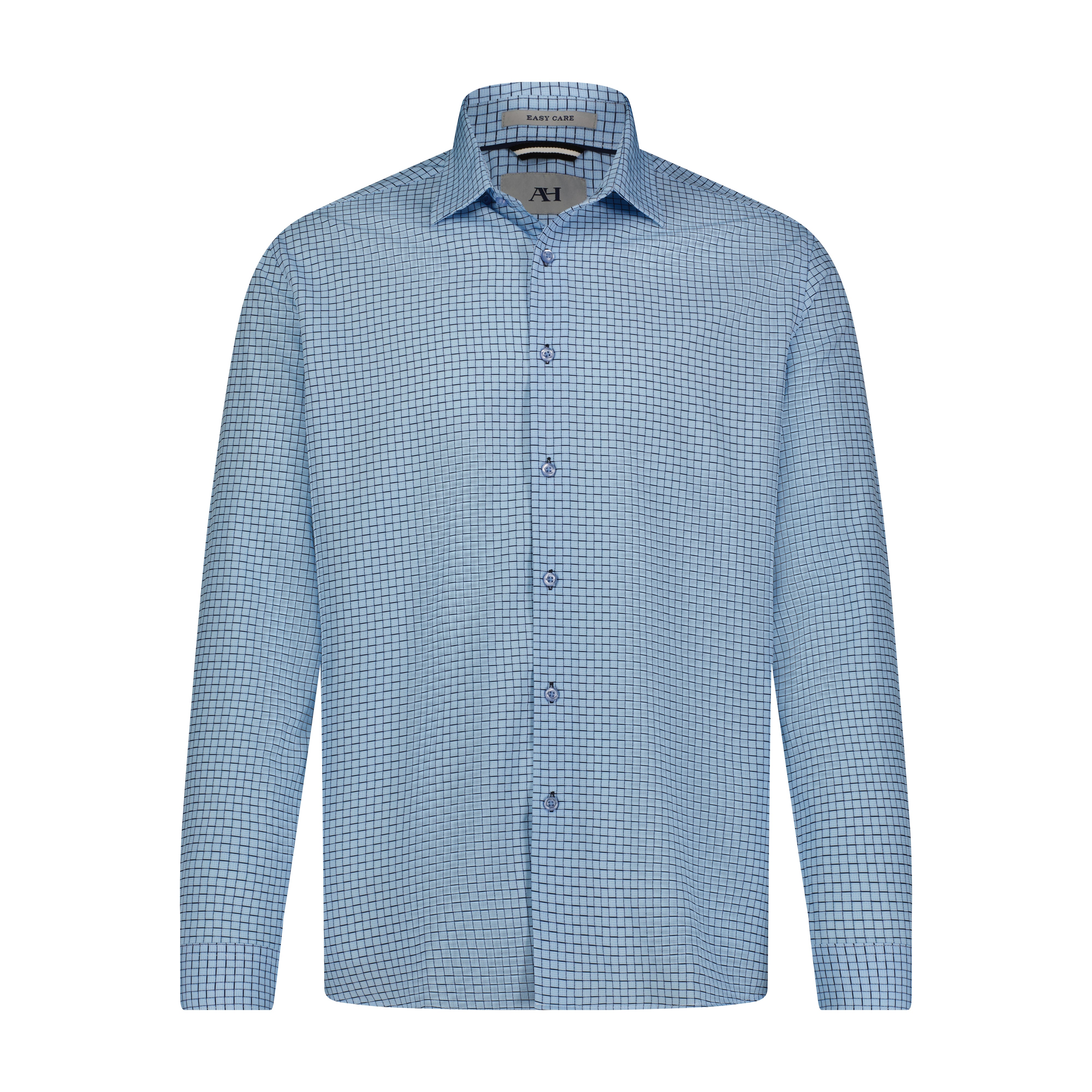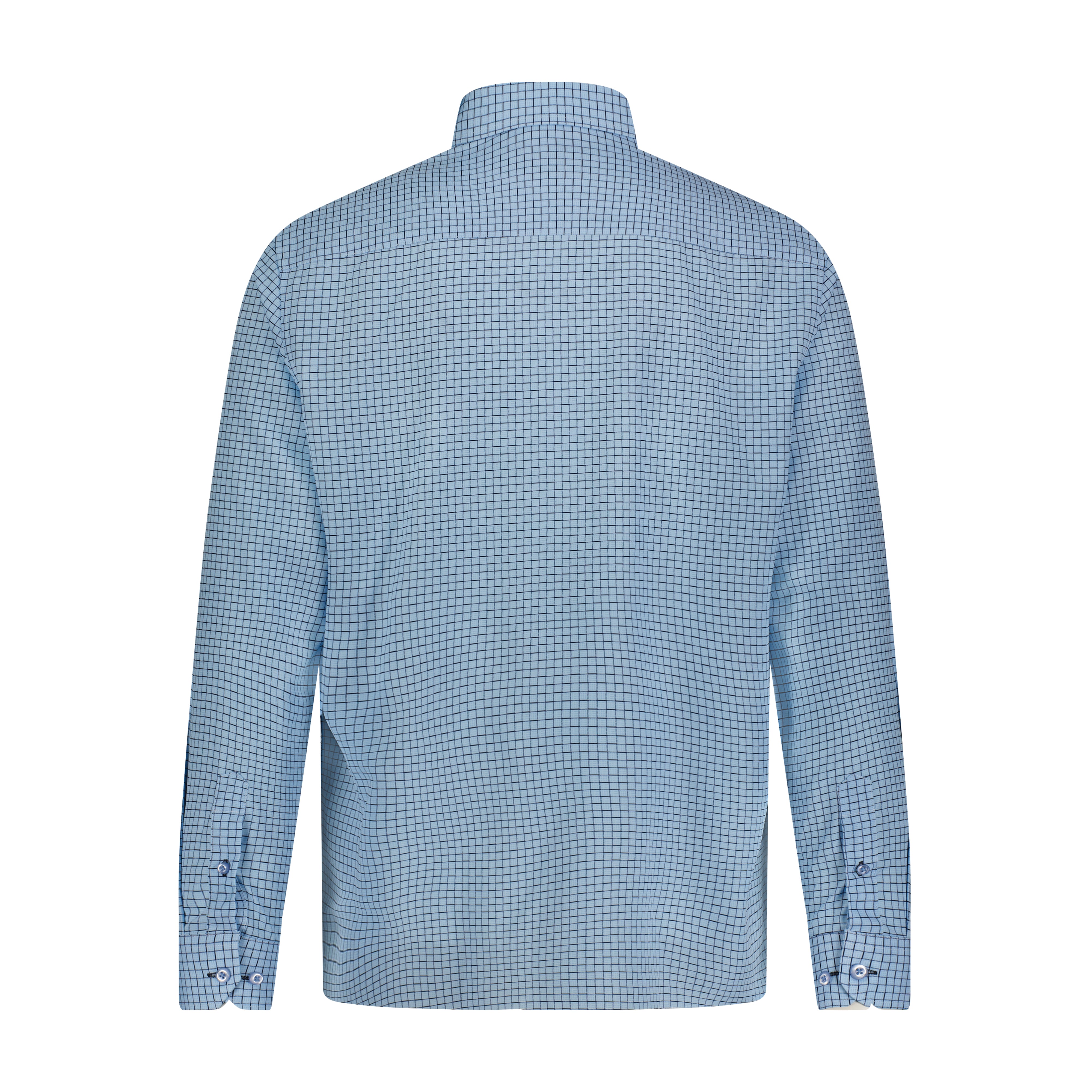 Introducing The Sky Blue Navy Check Hidden Button Down Long Sleeve Shirt, made with American Heritage fabric for a comfortable fit. With moisture-wicking, anti-microbial, and 4-way stretch properties, as well as an SPF 50 sun protection rating, this shirt is easy to care for and perfect for any outdoor activities.