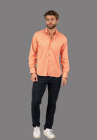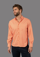 Long sleeve shirt in orange and white check with one pocket.
