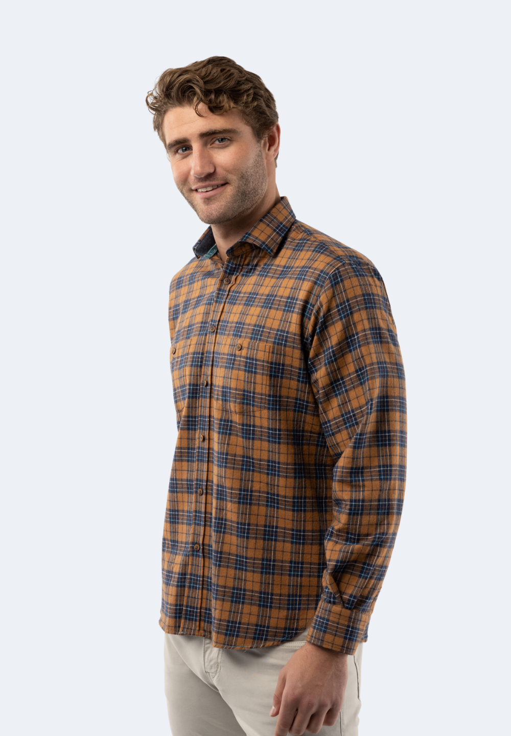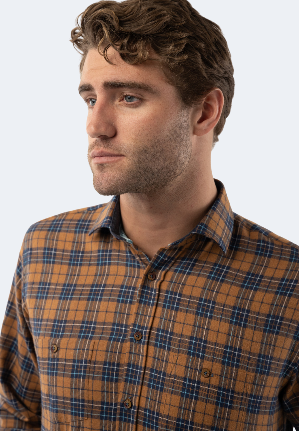 The Copper Brown Plaid Shirt is the perfect classic look of American Heritage with a modern twist. Crafted from recycled fabric, this shirt features a plaid pattern with chest pockets for a style that is both timeless and eco-friendly.