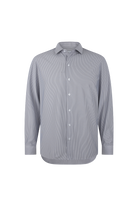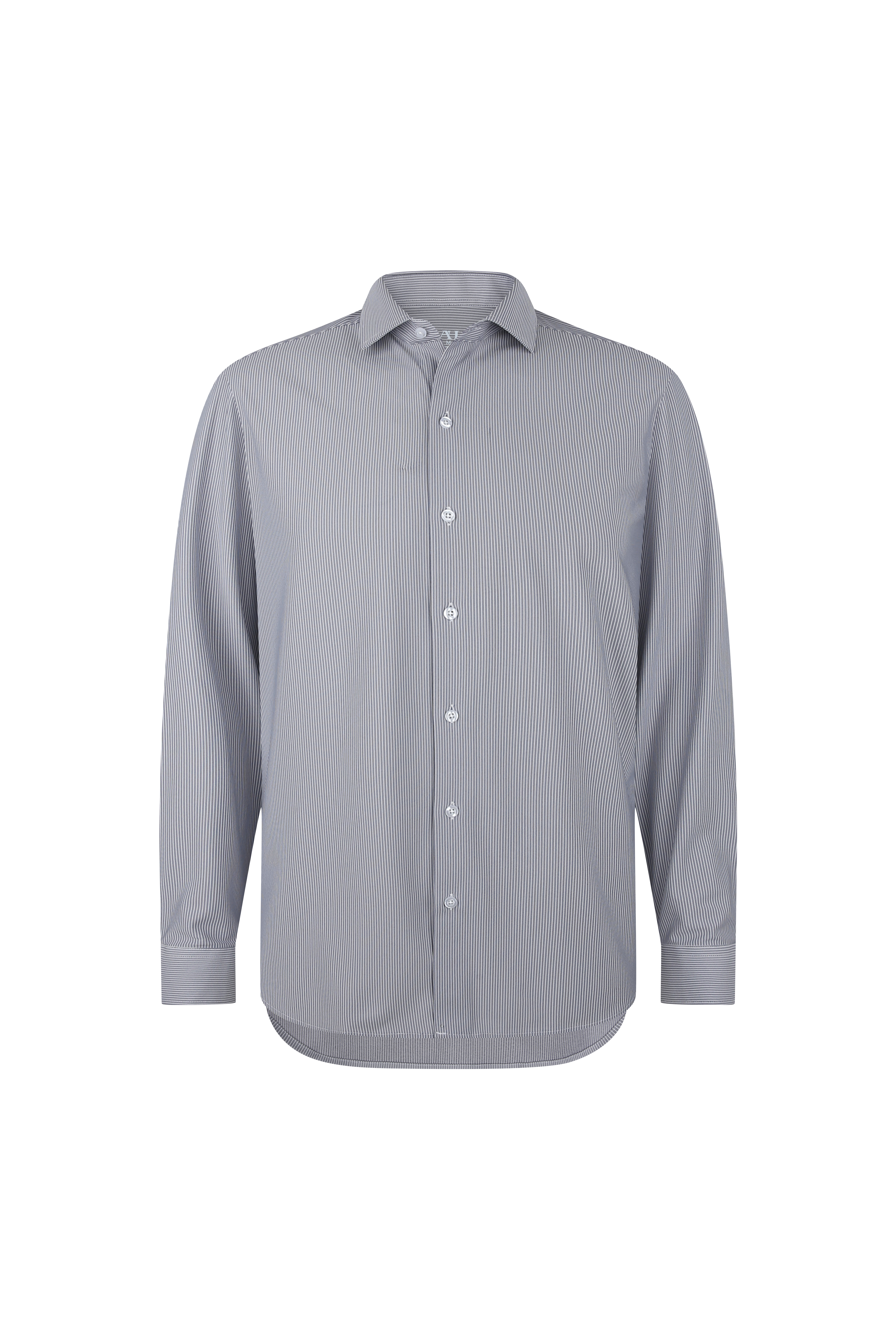 Timeless sophistication meets modern innovation in the Grey Striped Performance Dress Shirt. Featuring a clean blue pinstripe design, this versatile piece transitions seamlessly from office meetings to evening outings. Crafted from 96% recycled polyester with a touch of stretch, it delivers eco-conscious comfort alongside advanced performance features—4-way stretch, antimicrobial protection, moisture-wicking, SPF 50 sun defense, and wrinkle-free, non-iron ease. Lightweight, fast-drying, and exceptionally soft, this long sleeve shirt embodies Americana style with a polished, sustainable edge.