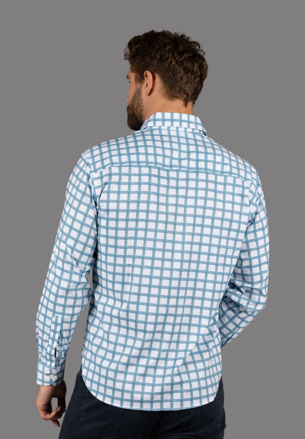 Long sleeve shirt in dark teal and white plaid with one pocket.