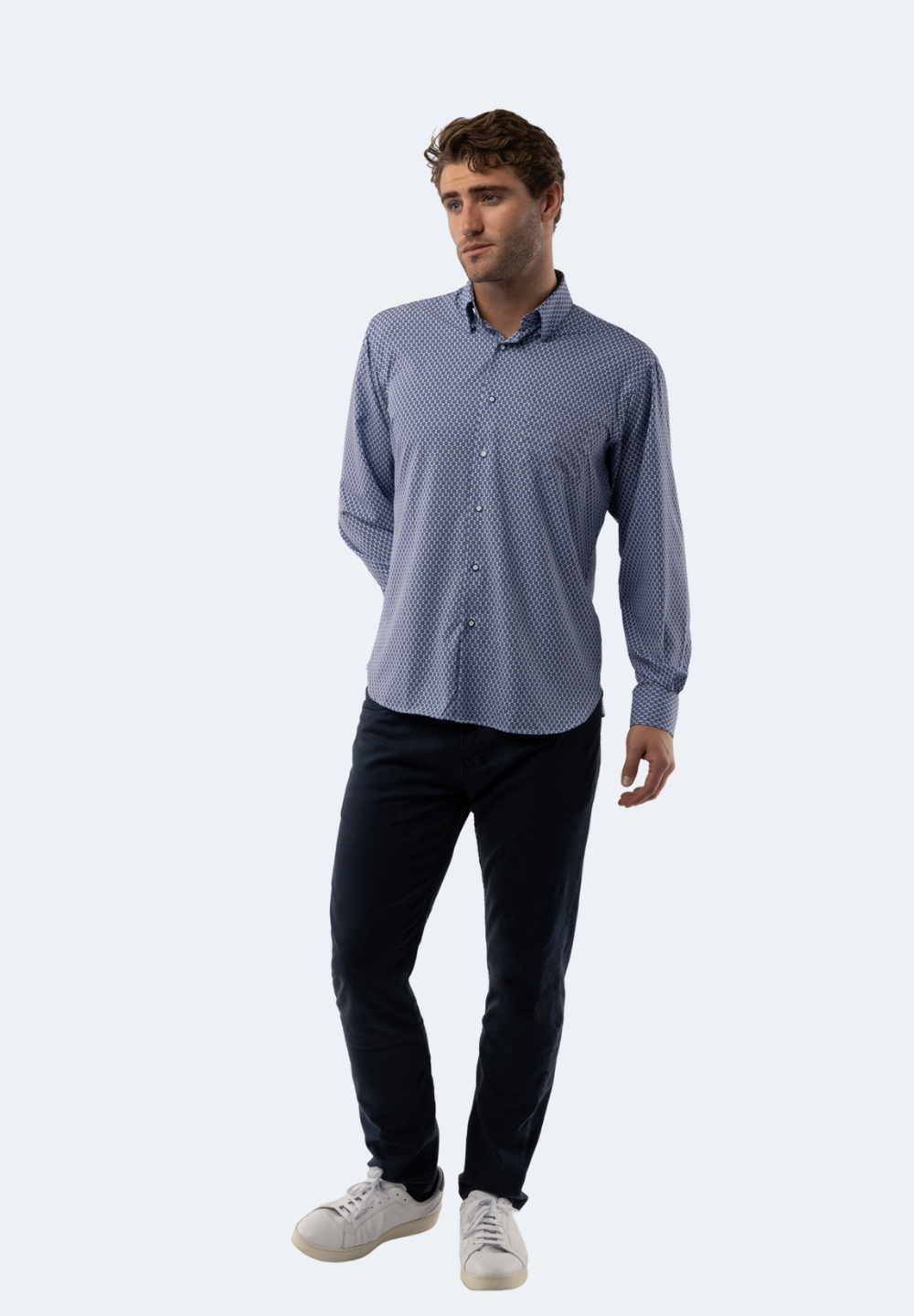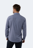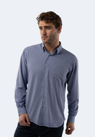 This White and Blue Circle Shirt combines American heritage with modern performance features like chest pocket, performance stretch, anti-odor, antimicrobial technology, and moisture wicking for all-day comfort and convenience.