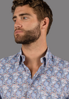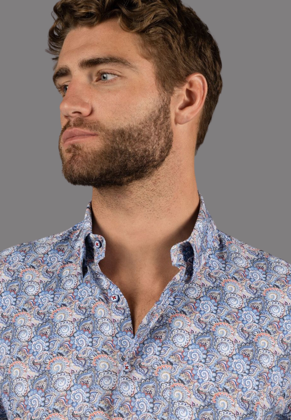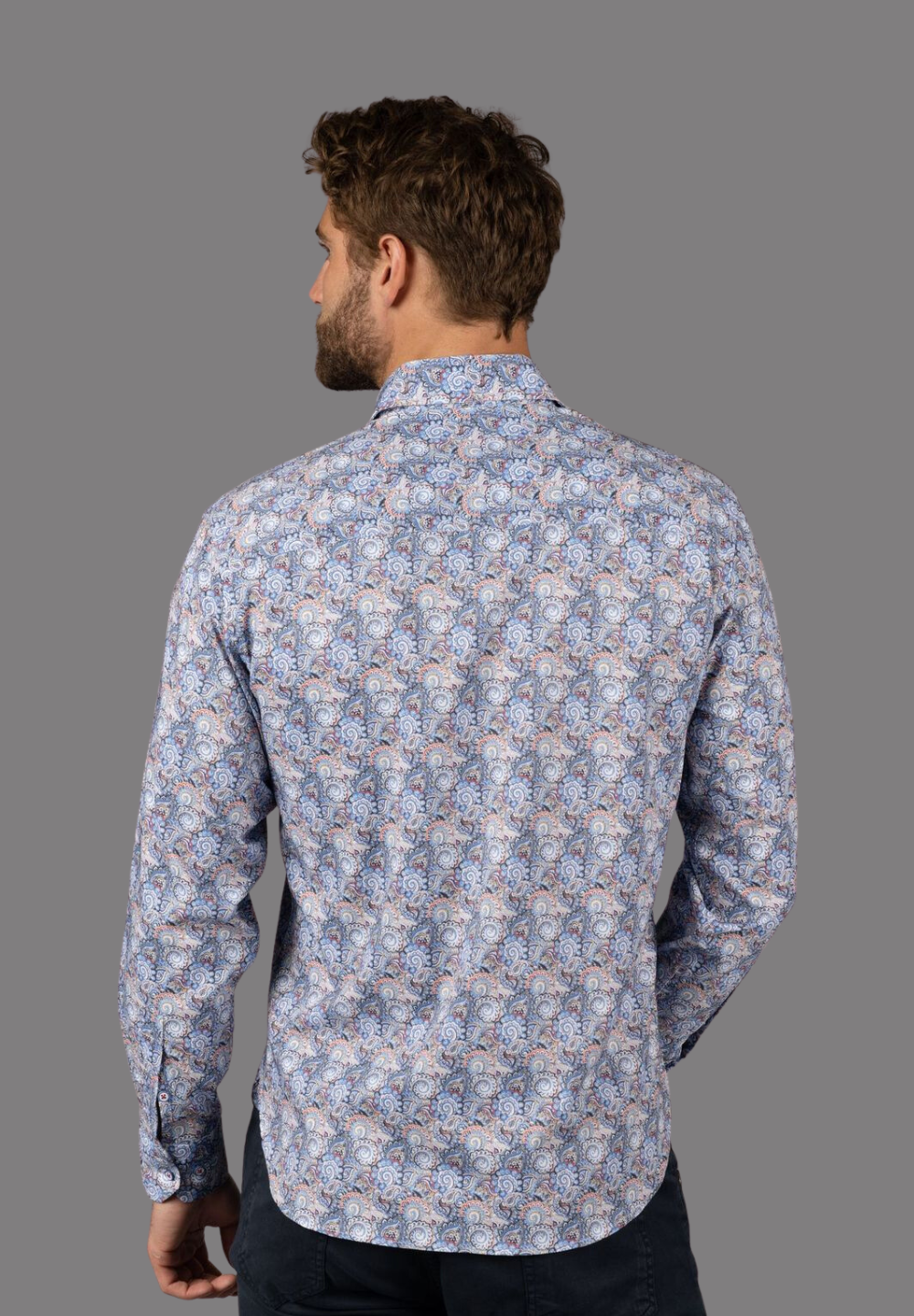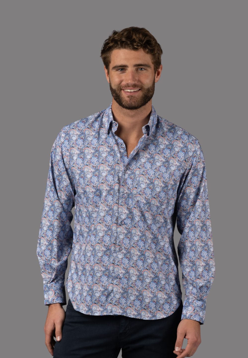 Long sleeve shirt in light sky blue, red, stone, beige and black paisley with