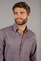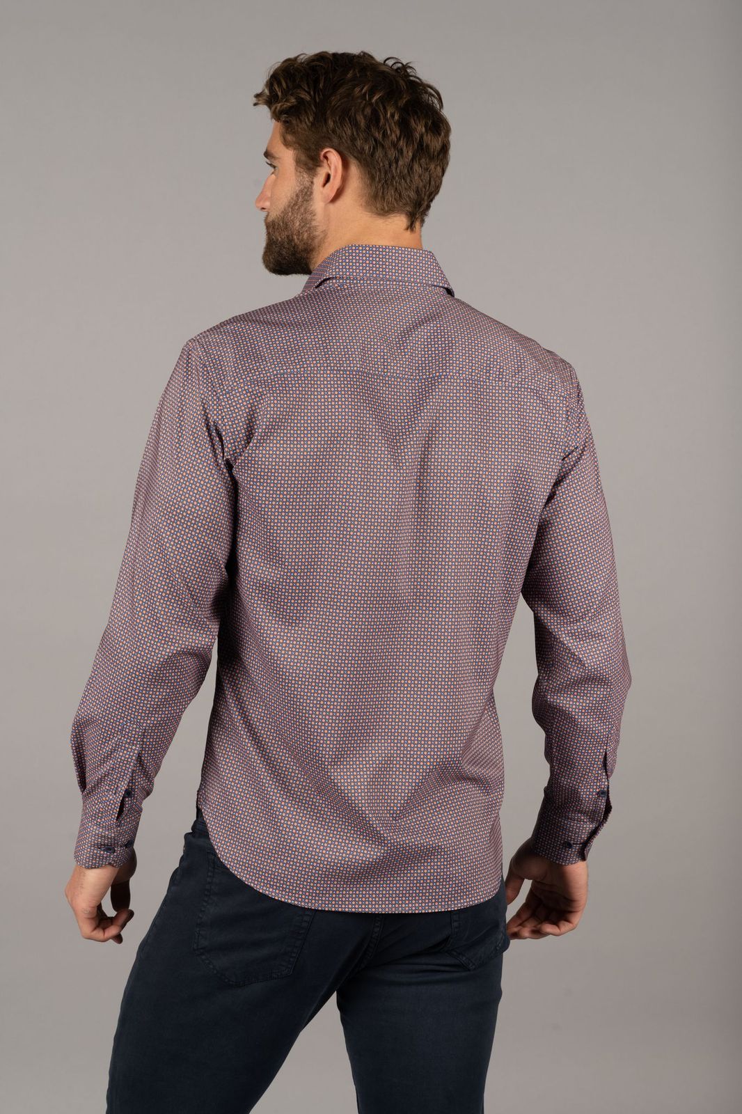 Long sleeve shirt with navy, grey and orange circles and one pocket.