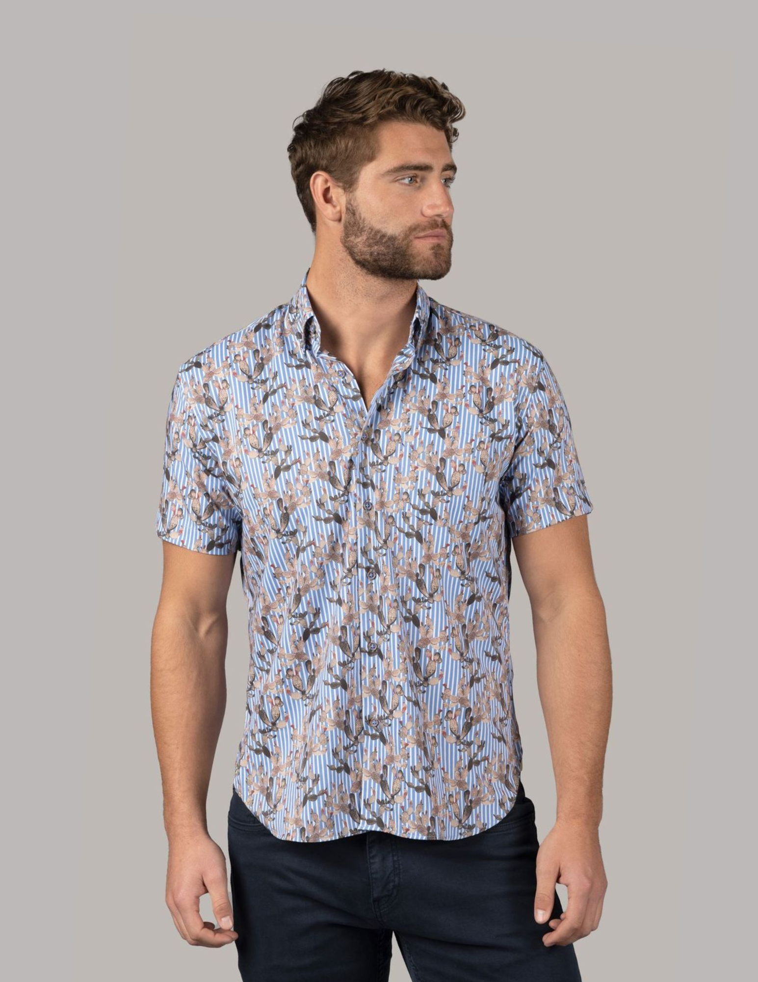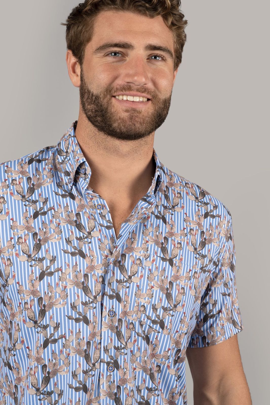 Short sleeve shirt with white and cornflower blue stripes with beige cactus print and one pocket. Material is a moisture wicking performance stretch made from recycled yarn.