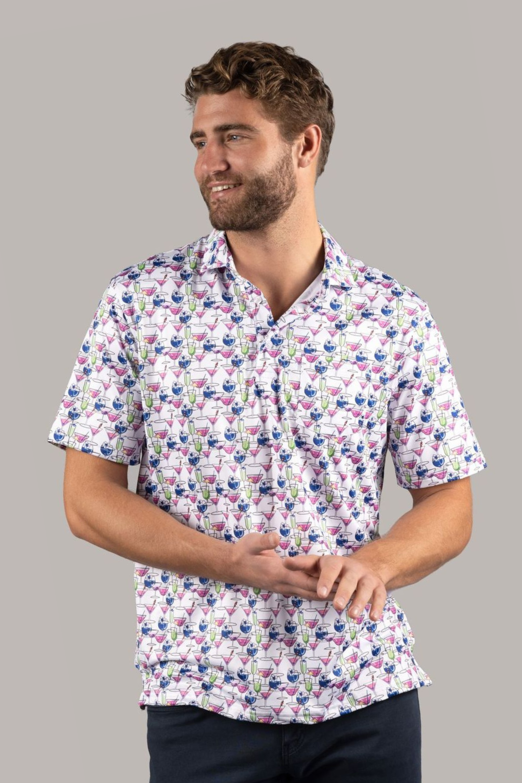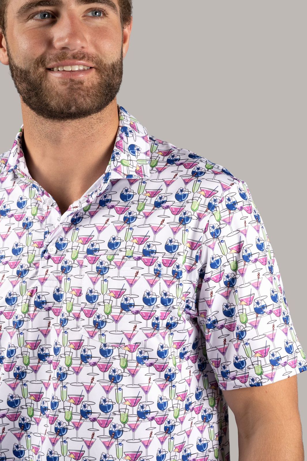 Short sleeve shirt in white with blue, pink and green cocktails and one pocket.