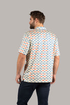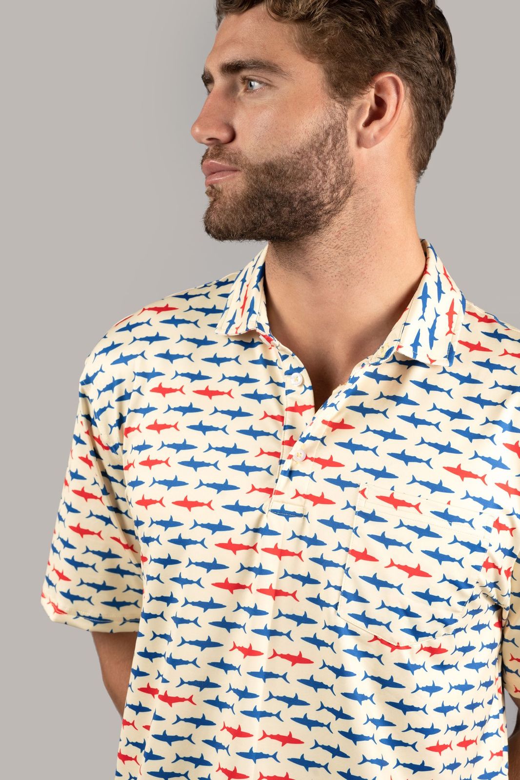 Short sleeve shirt in yellow with blue and red sharks and one pocket.