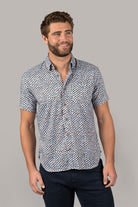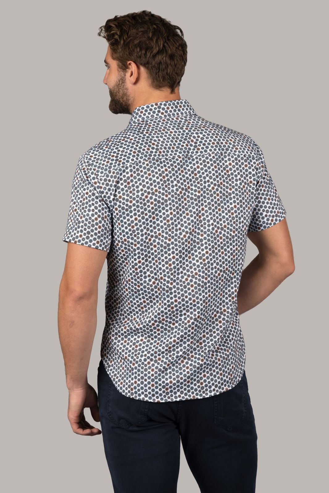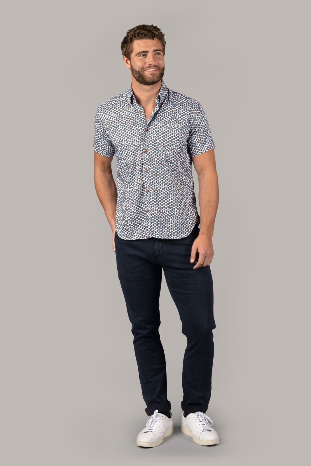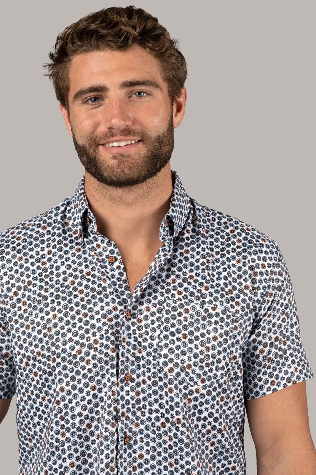 Short sleeve shirt in white with navy, light blue, burnt orange circles and one