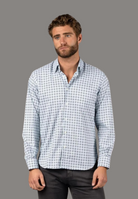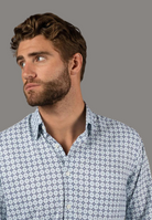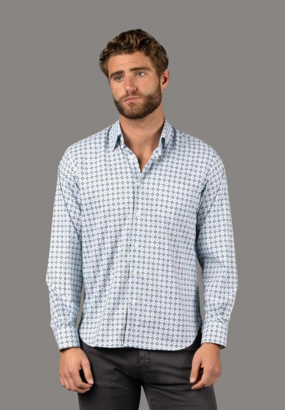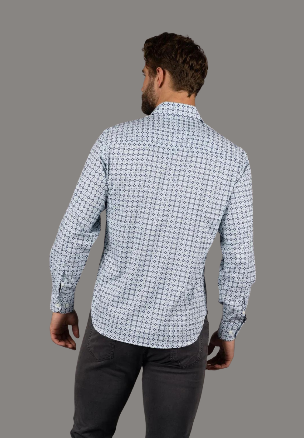 Long sleeve shirt with navy, blue and white diamond stripes and aquamarine swirls with one pocket.