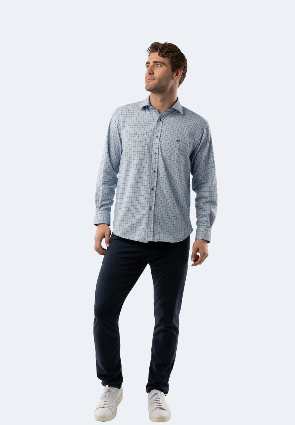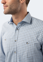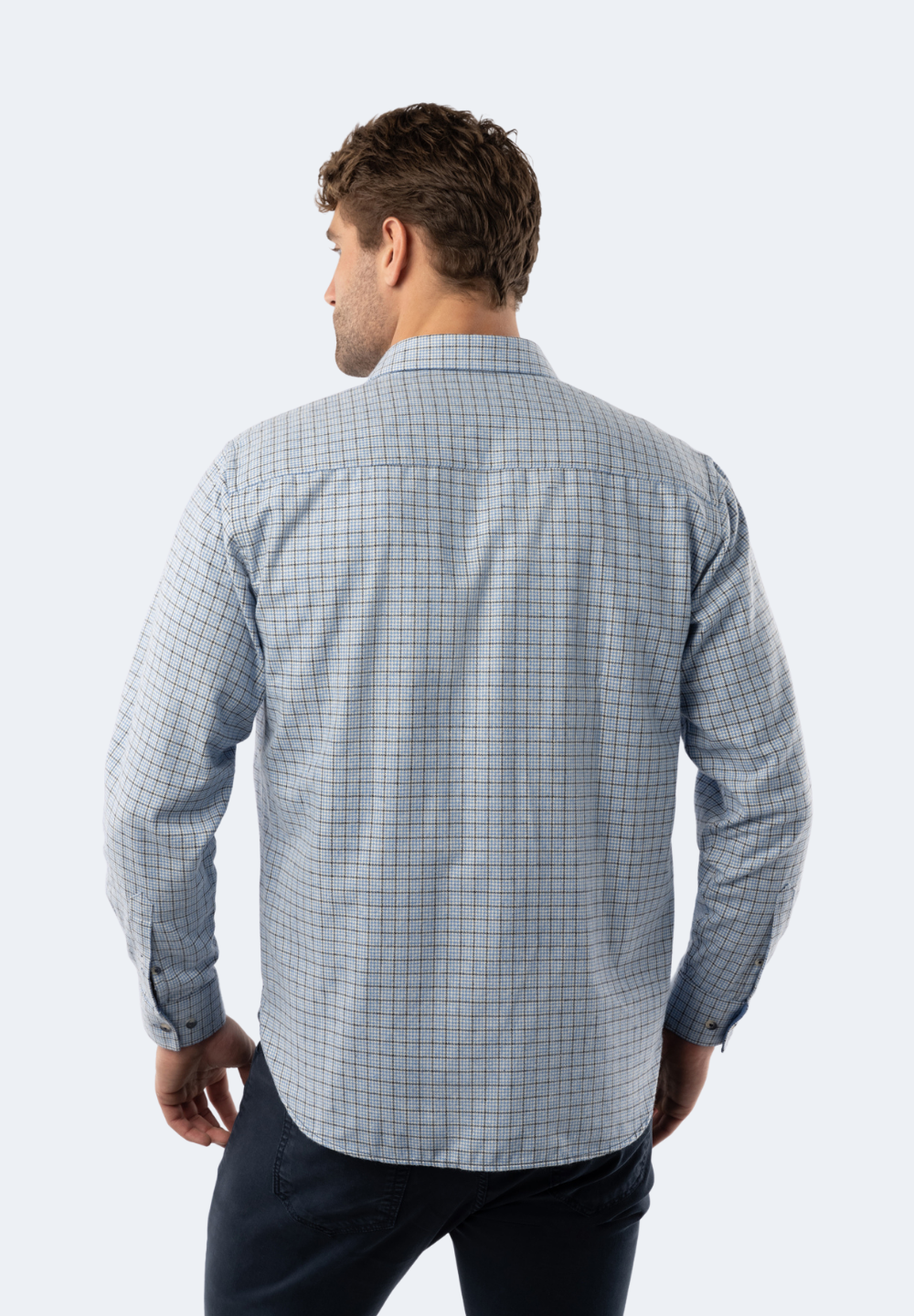 This Baby Blue Houndstooth Plaid Shirt is crafted from American Heritage recycled fabric and features chest pockets. Perfect for any formal occasion, this shirt combines style and sustainability.
