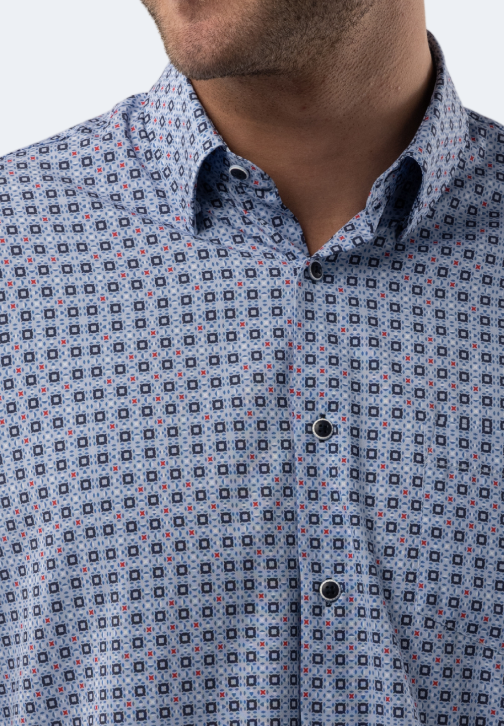 Our Baby Blue with Red X Marks Shirt delivers a classic American Heritage style with features that will keep you comfortable and dry. This shirt is engineered with performance stretch, antimicrobial technology, moisture wicking, and anti-odor technology for ultimate comfort. It also includes a convenient chest pocket for convenience.