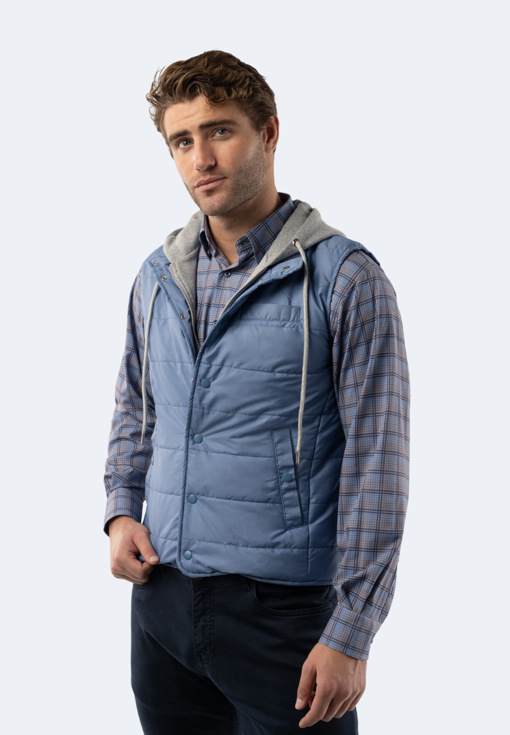 This Blue Hooded Vest from American Heritage is the ideal choice for colder days. Crafted with side pockets, full snap and zip, and a hood for extra warmth, it is sure to become a staple of your wardrobe.