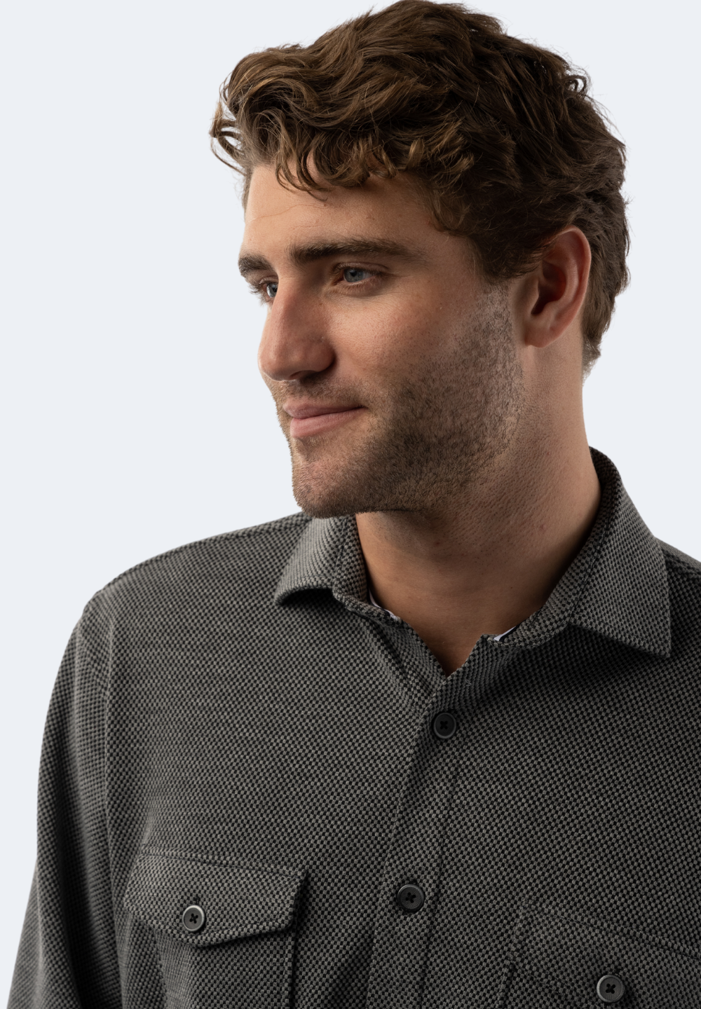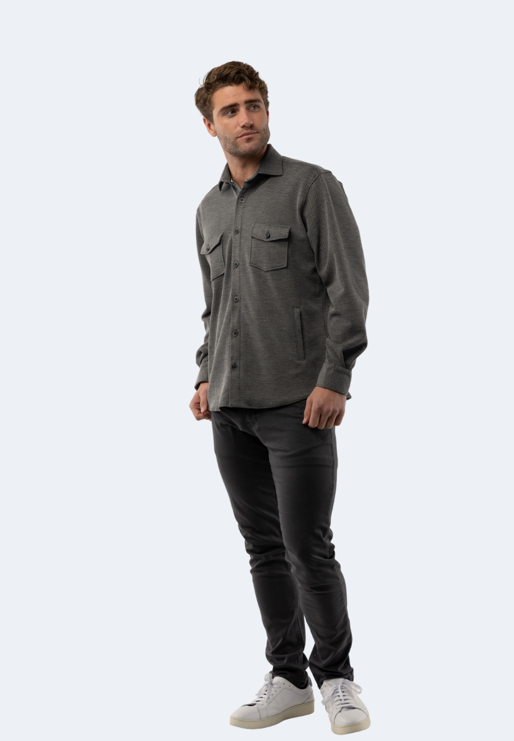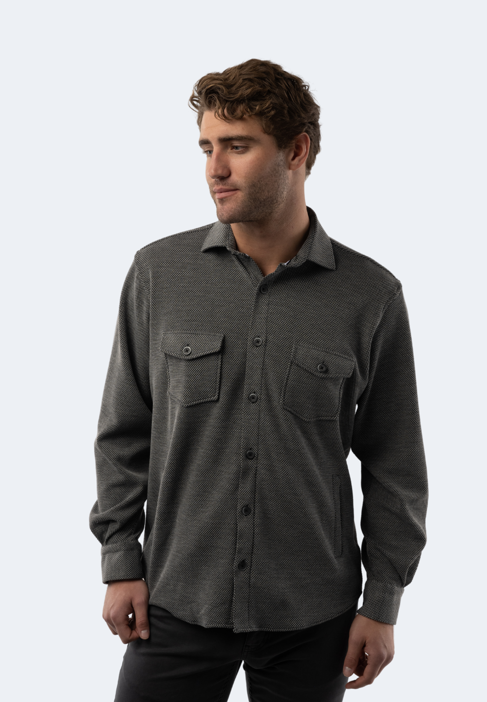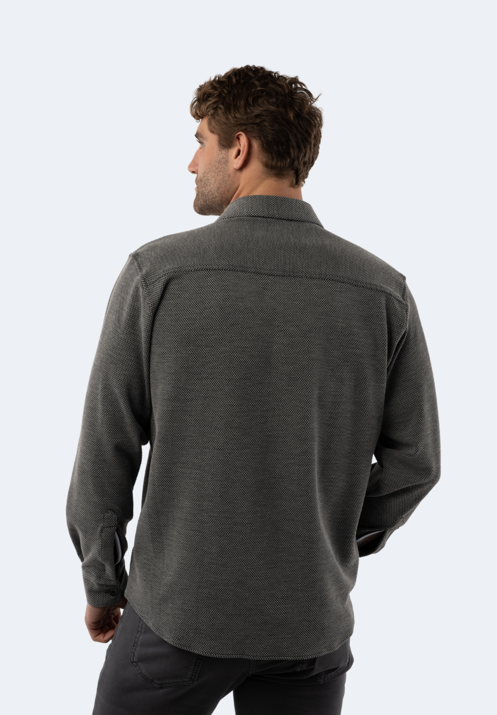 This Fossil Grey Knit Shirt is a versatile American Heritage garment that can be worn as a shacket, button down shirt, or as a layered piece. It features two chest pockets for extra storage and convenience. Enjoy the comfort of this knitted fabric and the freedom to style it in multiple ways.