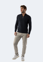 This Waffle Stripe Quarter Zip is made from American Heritage fabric and features a waistband collar and a stylish 3/4 zip. Its classic waffle stripe pattern is both timeless and on-trend. Make a fashion statement with this versatile and comfortable piece.
