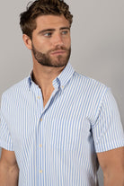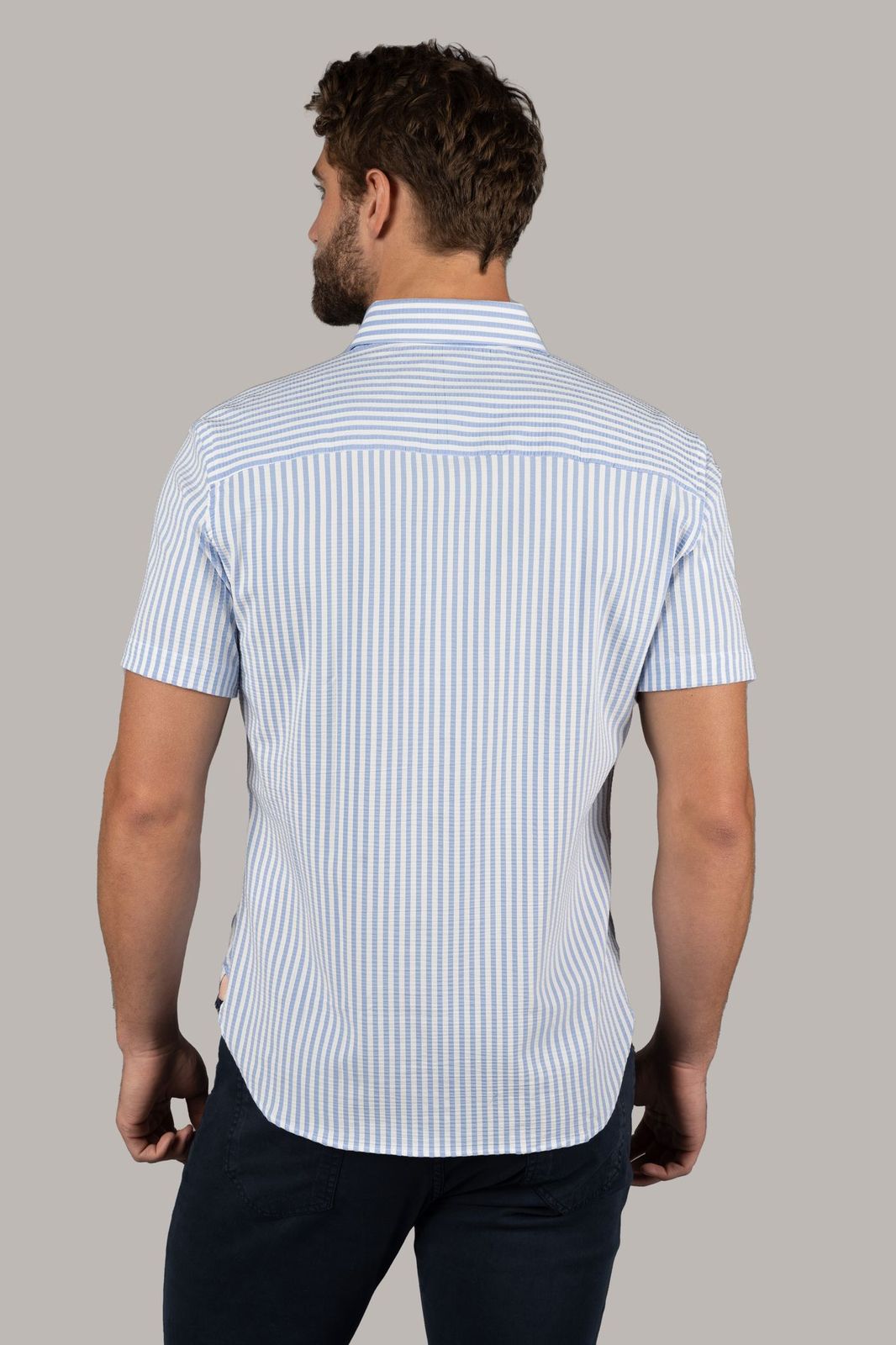 Short sleeve in sky blue with seersucker stripes and one pocket.