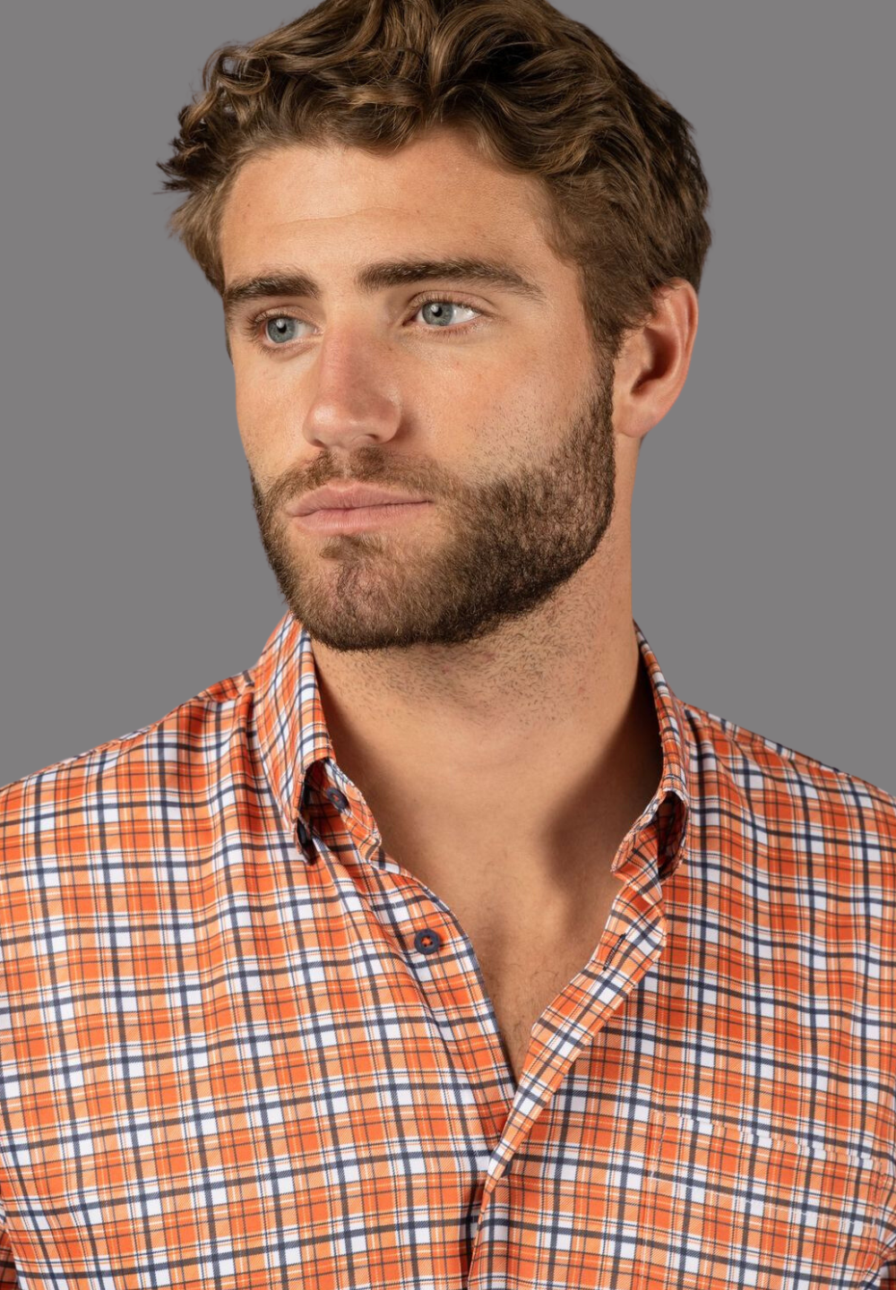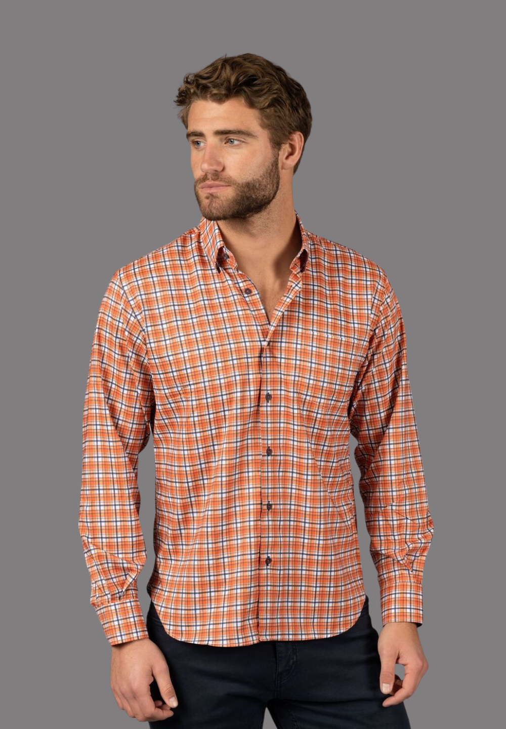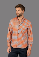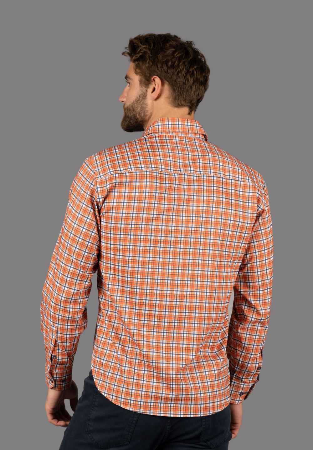Long sleeve shirt in orange, navy & white plaid with one pocket.