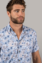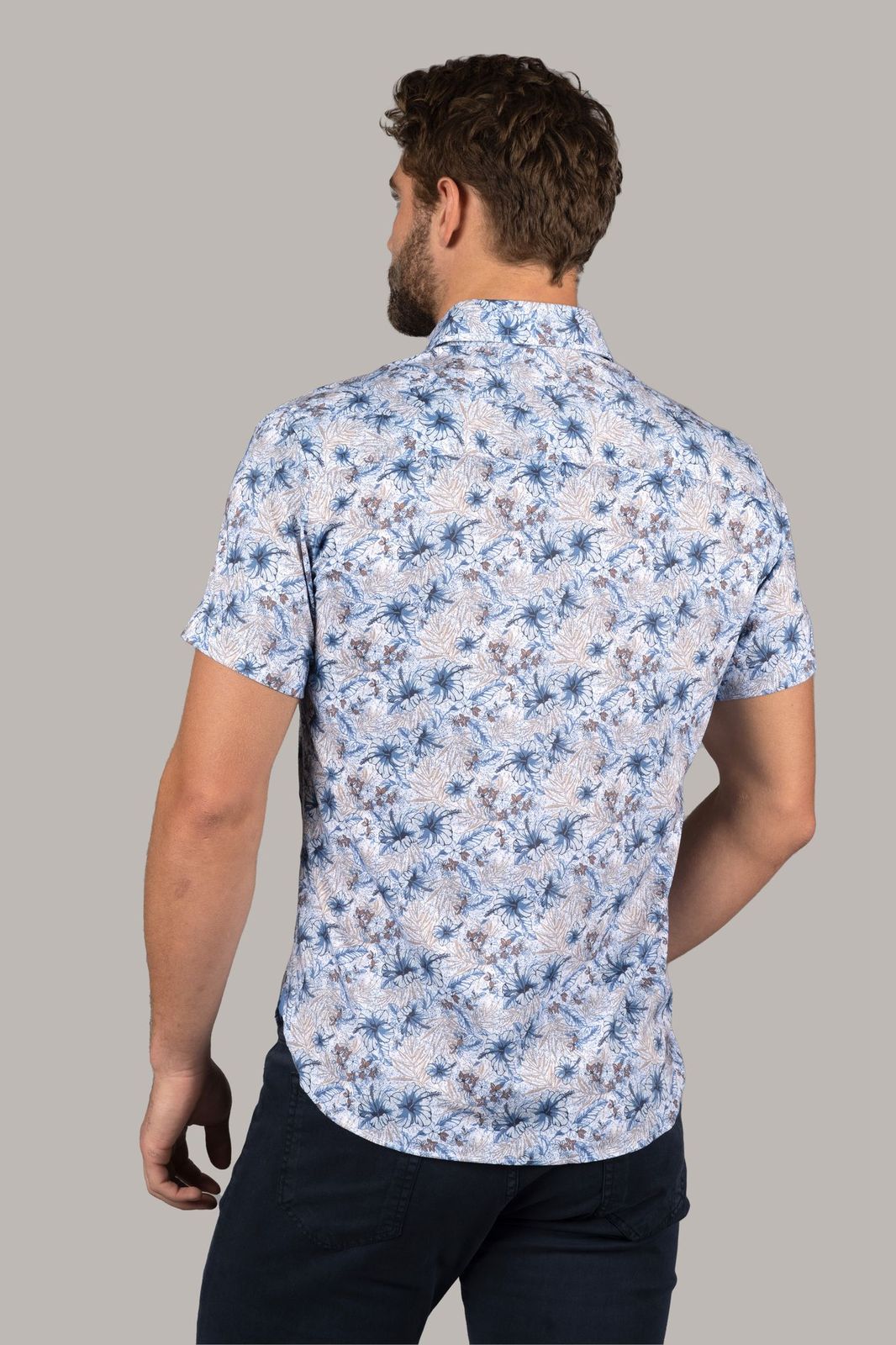 Short sleeve shirt in white with blue and brown flowers and one pocket. Material is a moisture wicking performance stretch made from recycled yarn.