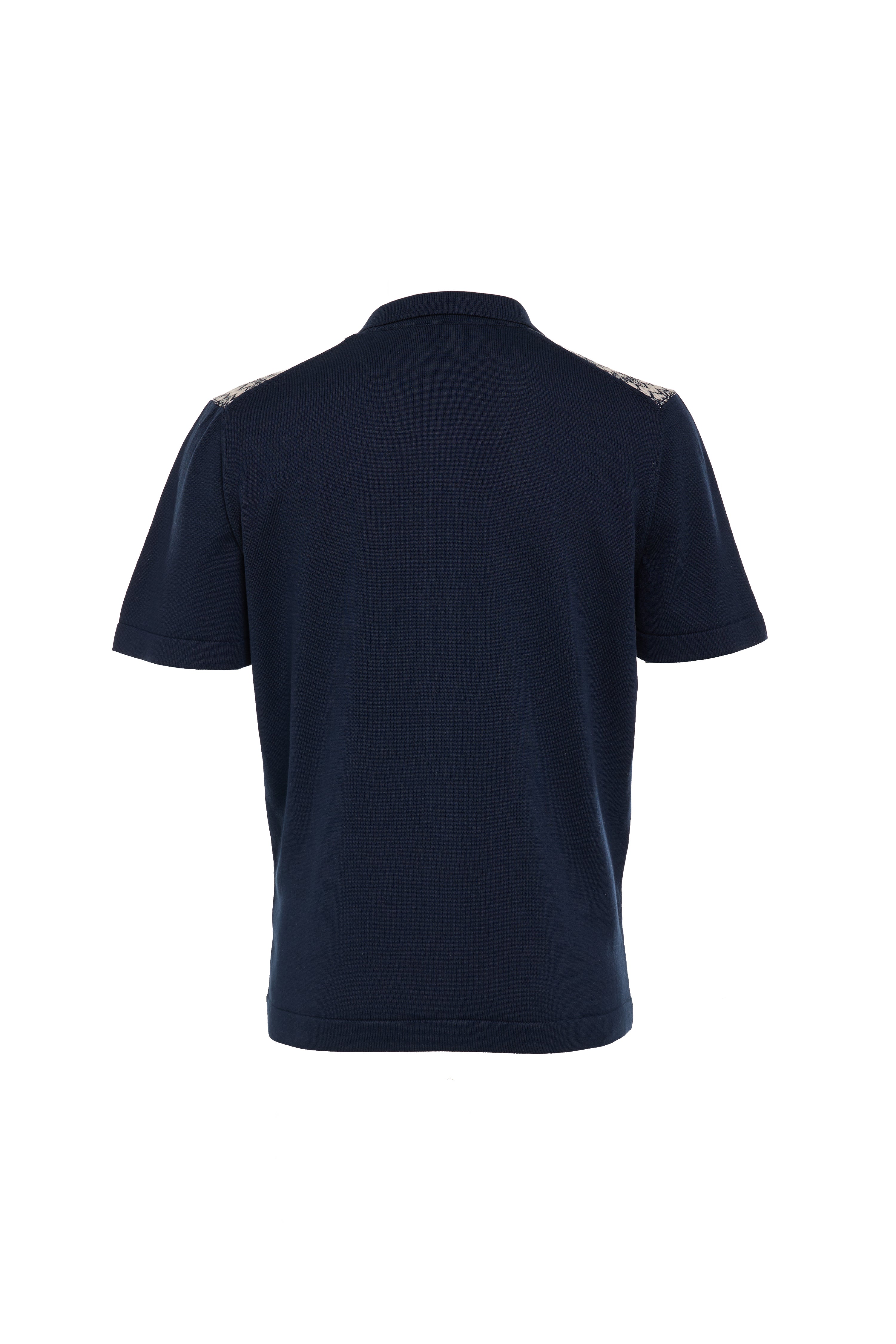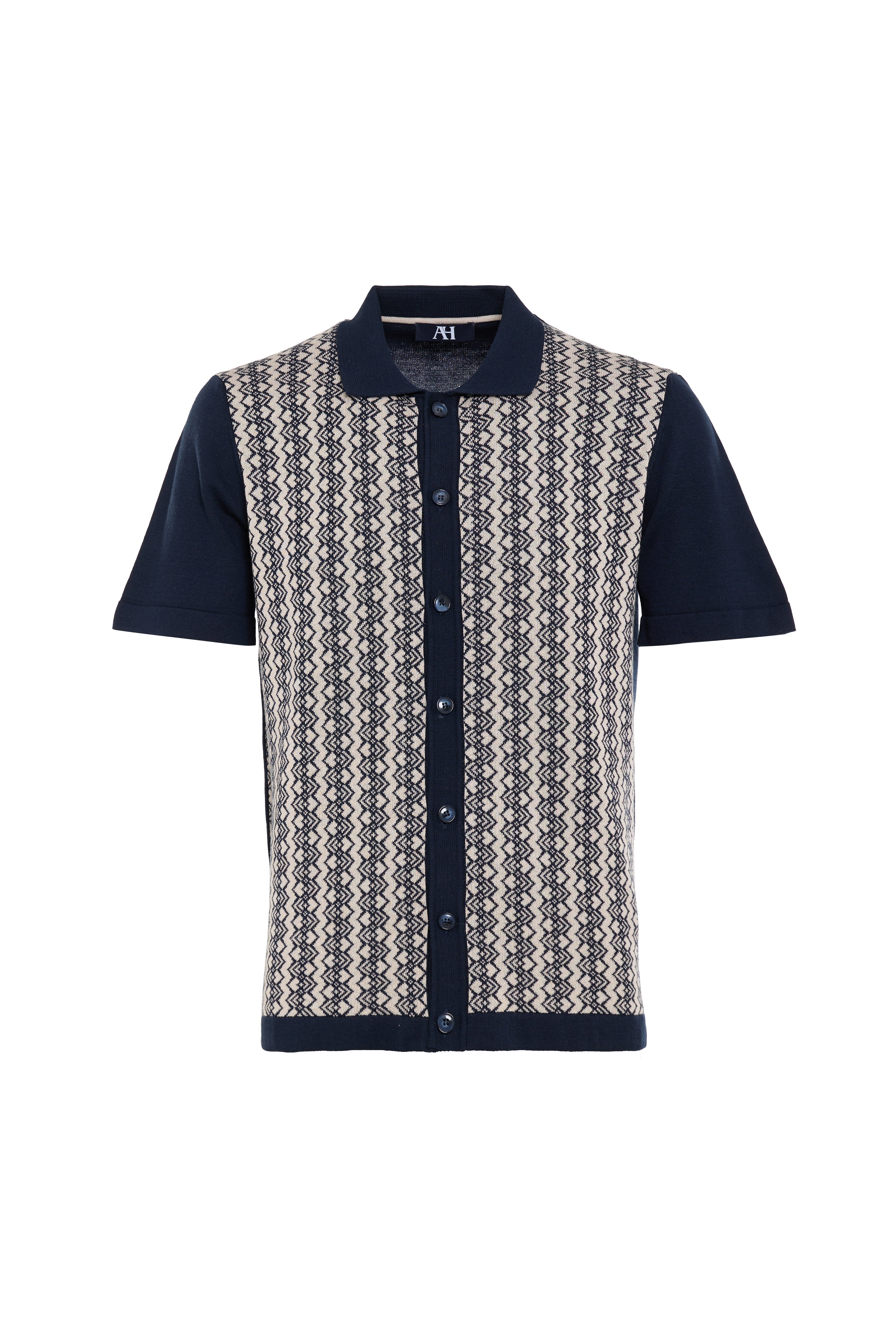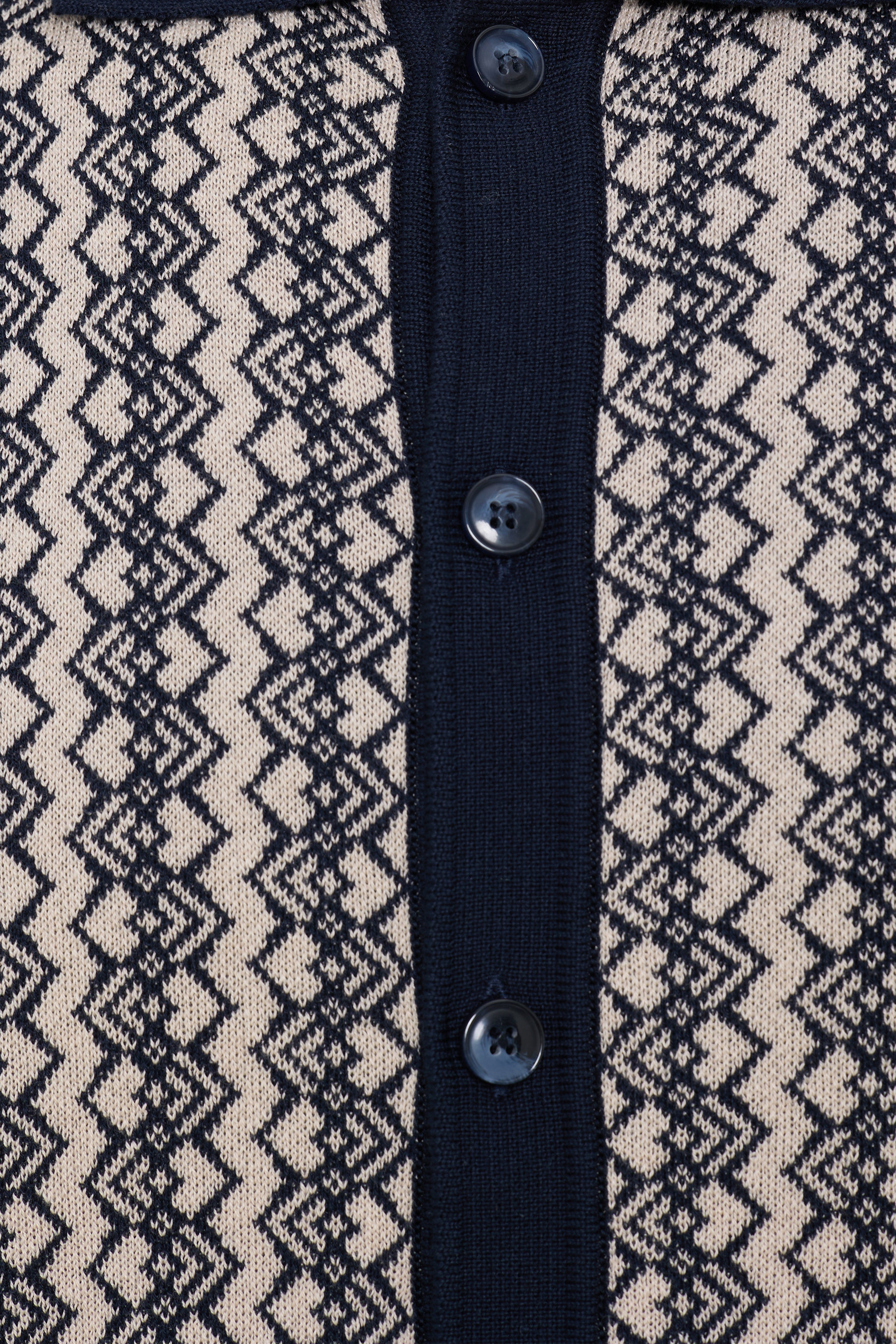 Full button front jacquard weave with solid black cuff and collar knit.