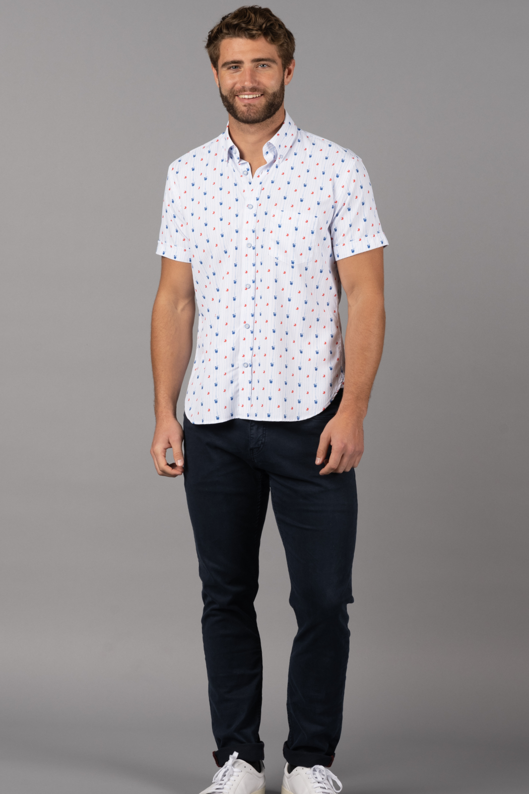 Short sleeve shirt in white with light blue stripes and blue cocktails and orange slices fruit slices. The shirt has 6-way stretch for all day comfort.
