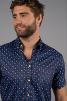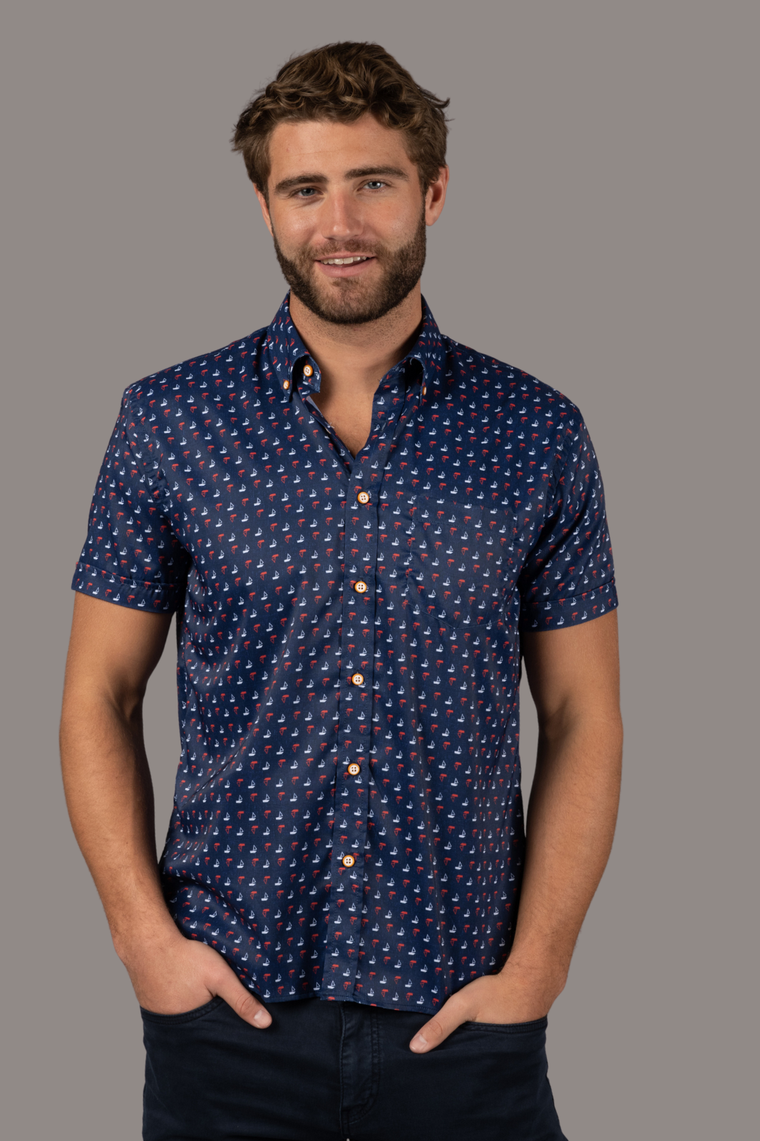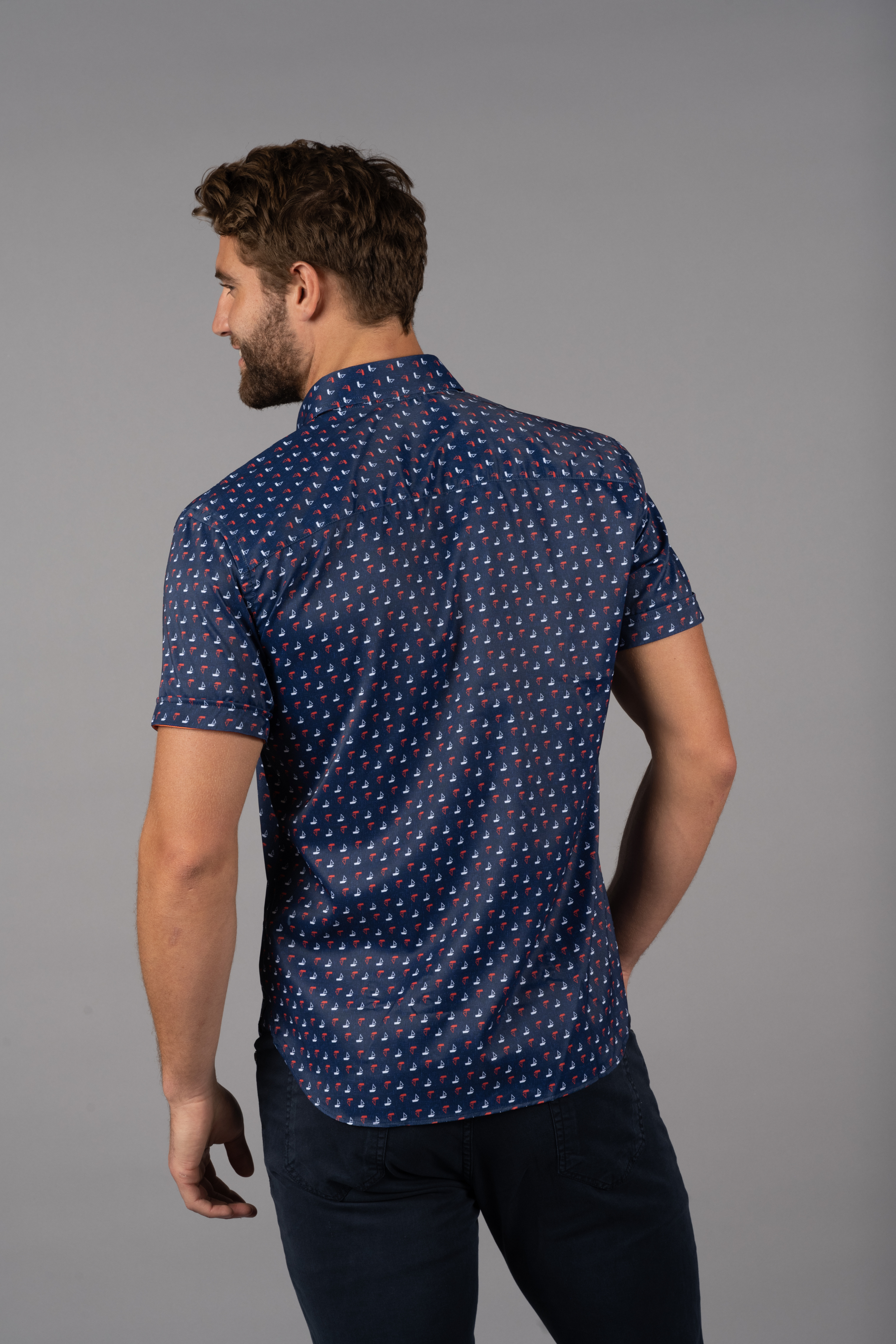 Short sleeve shirt in navy with red and white sailboats. The shirt has 6-way stretch and the material is 67% cotton, 30% modal and 3% elastin.