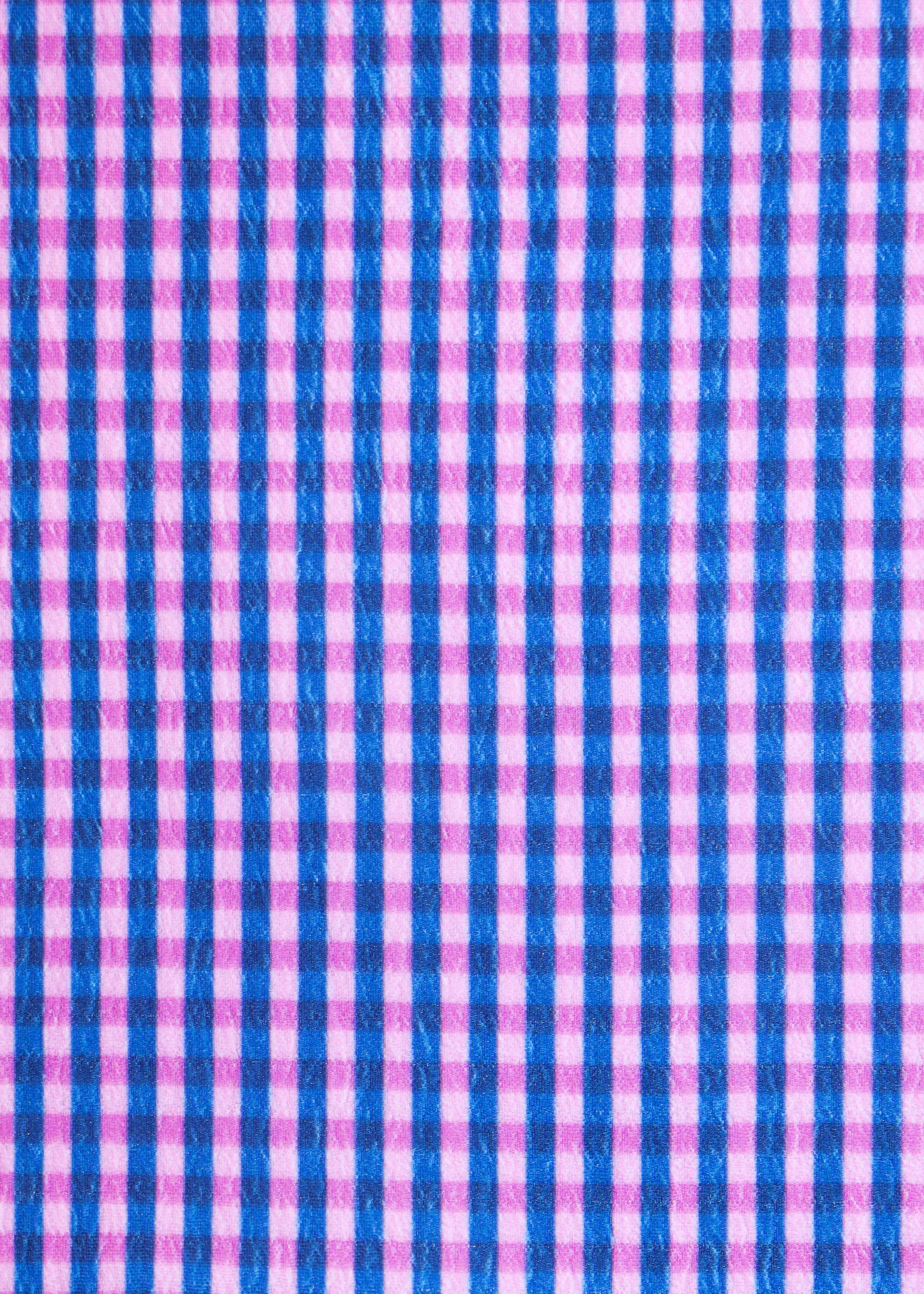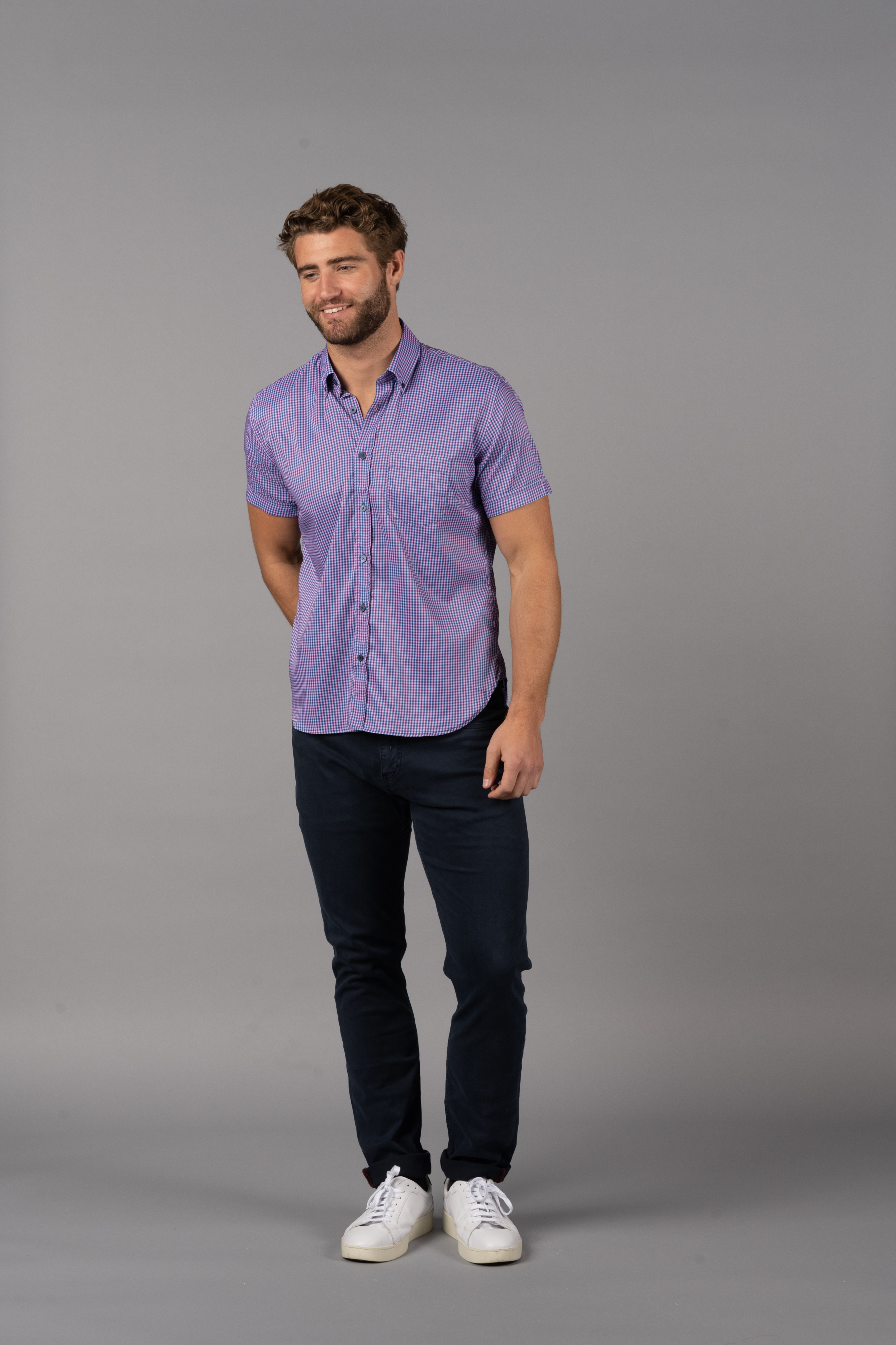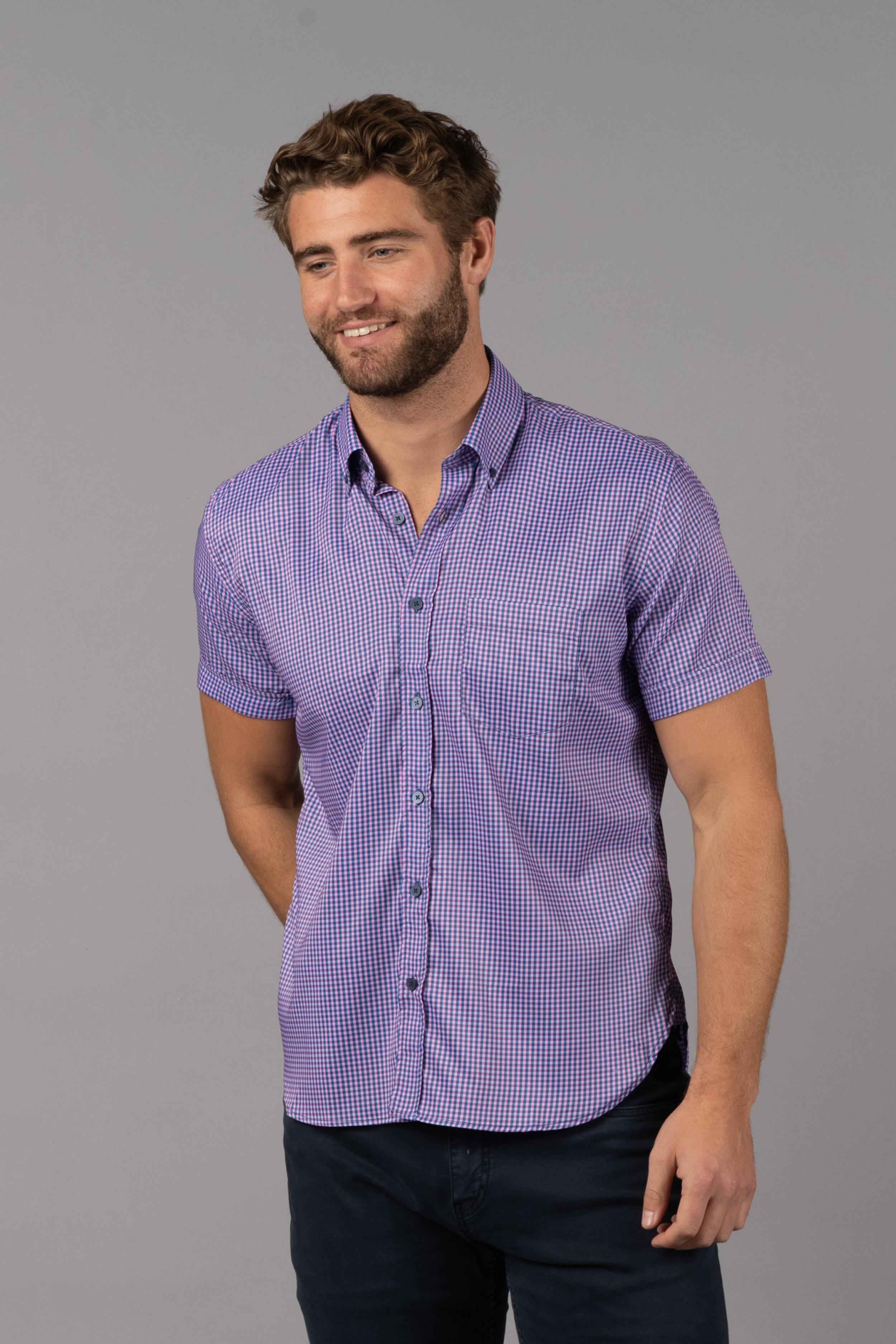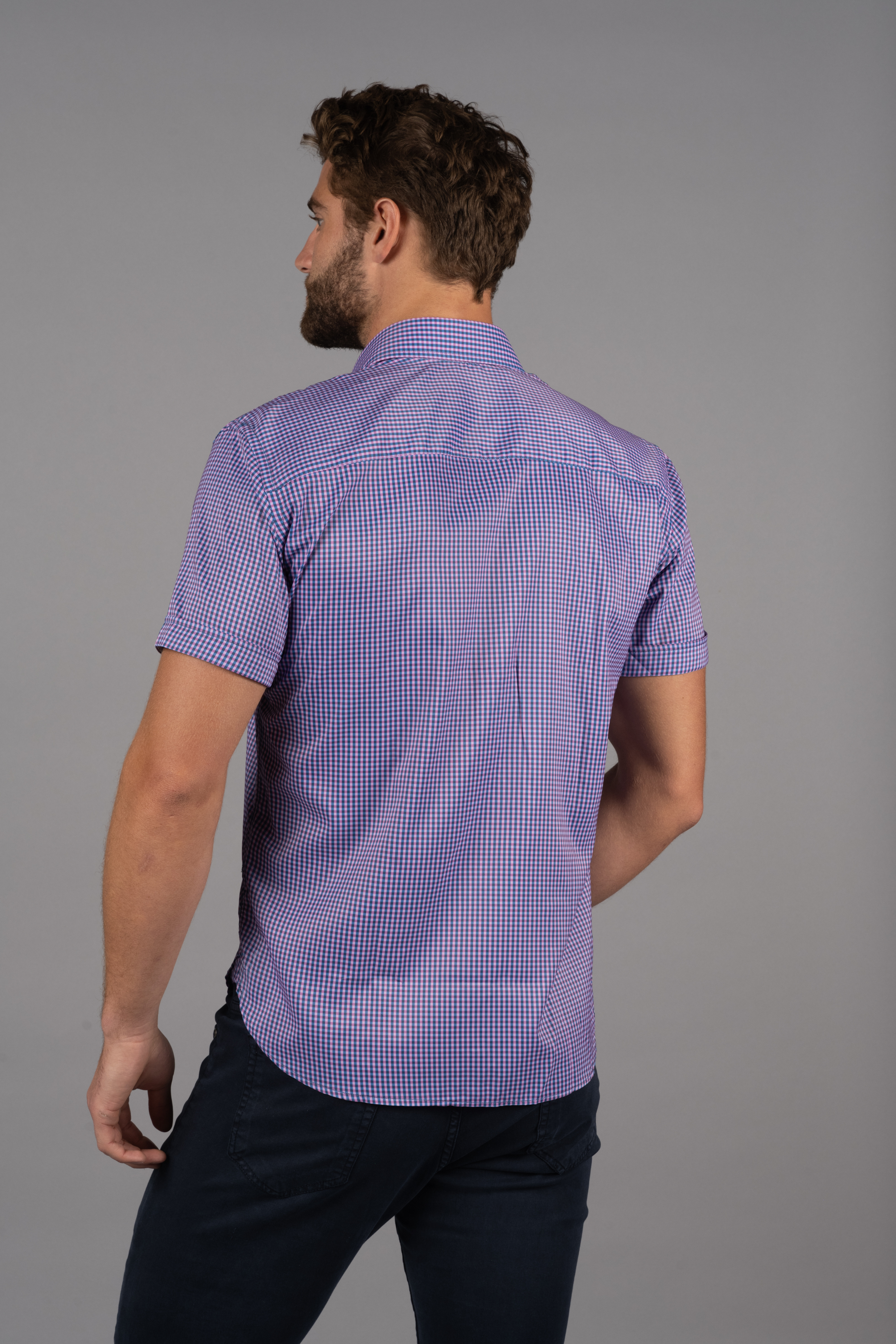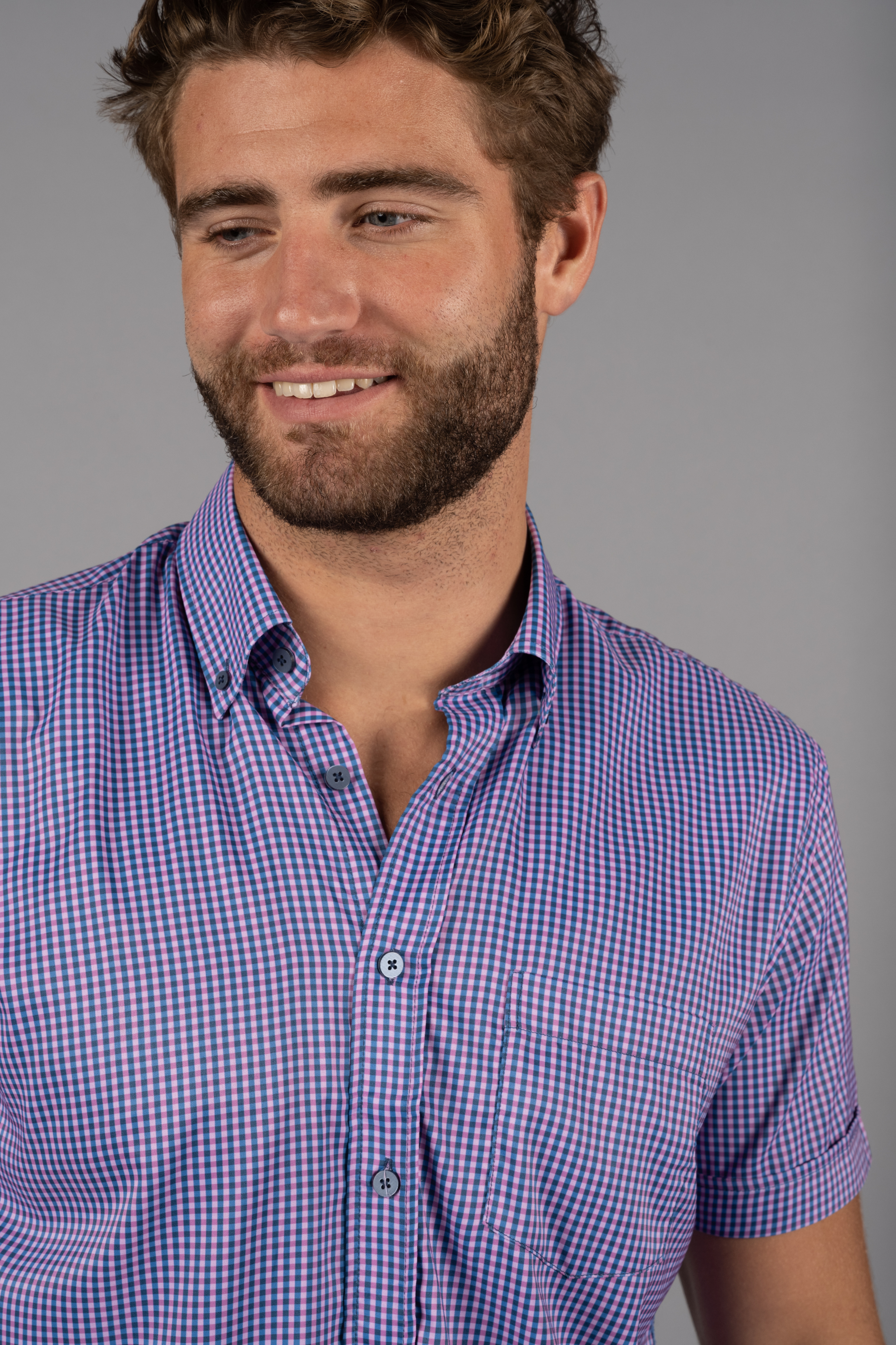 Short sleeve shirt in pink and navy. The shirt has 6-way stretch and the material is 67% cotton, 30% modal and 3% elastin.