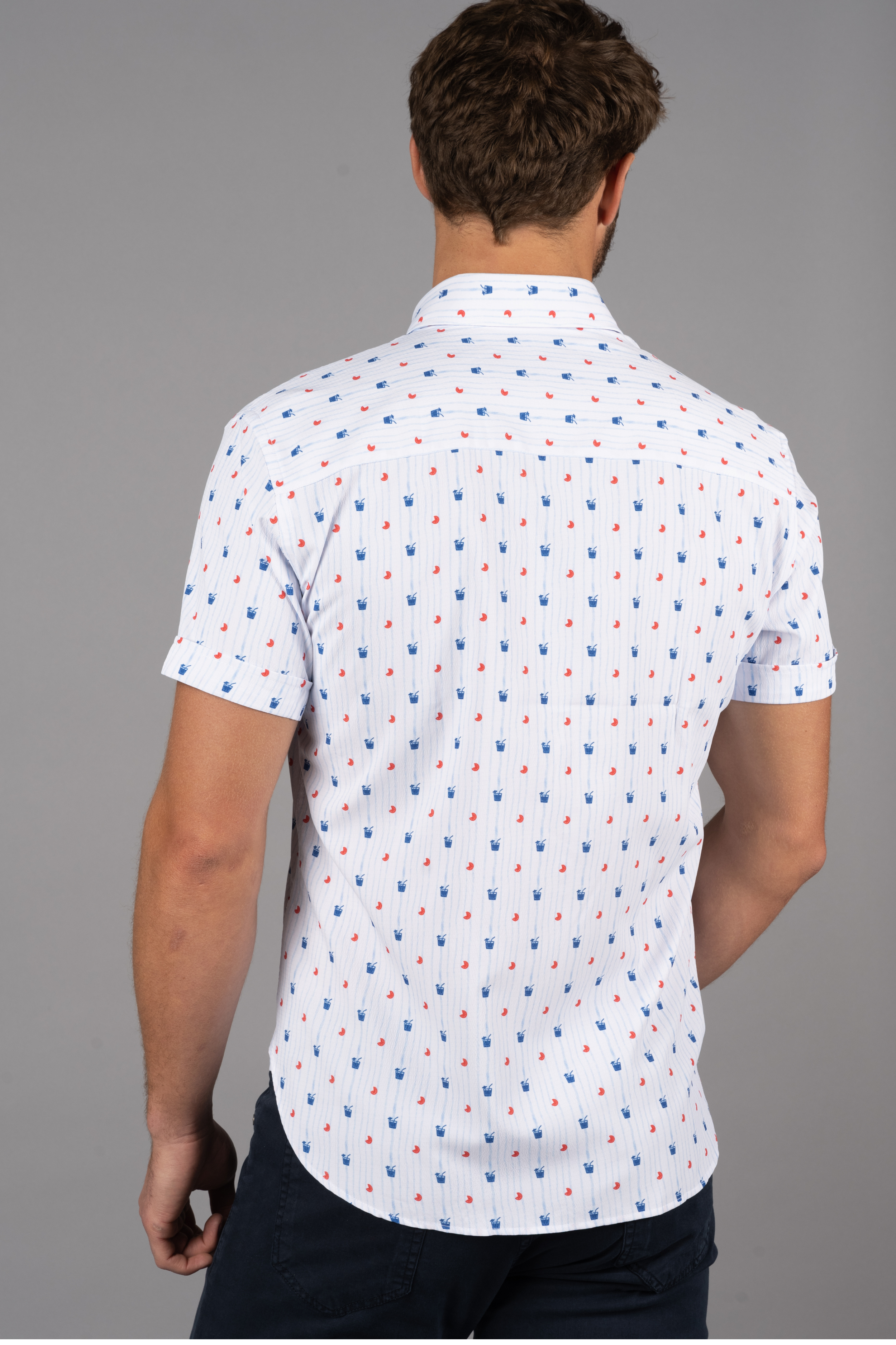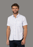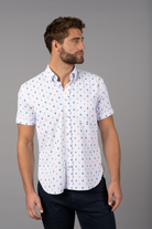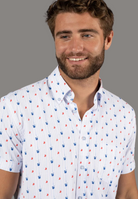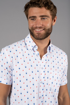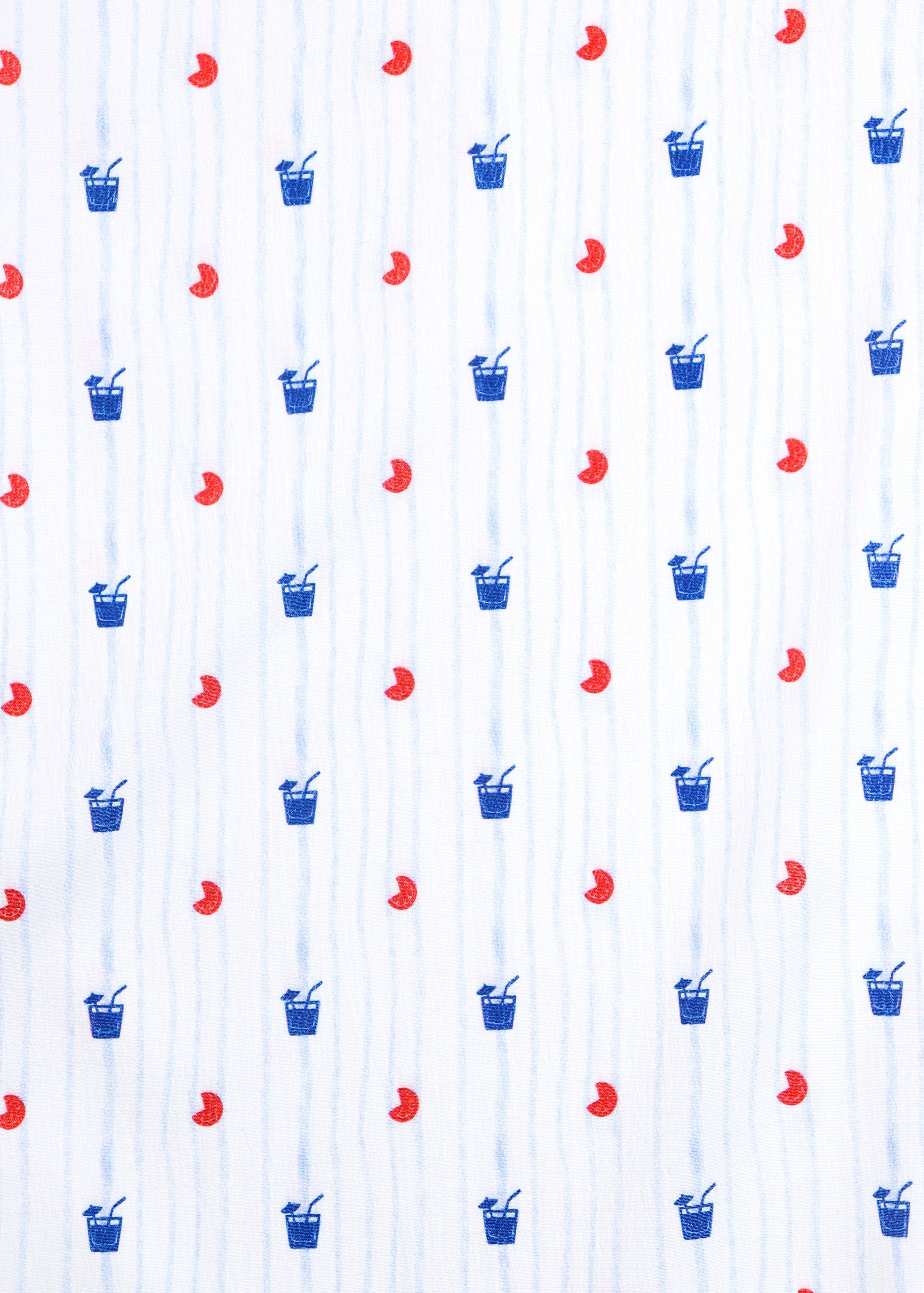 Short sleeve shirt in white with light blue stripes and blue cocktails and orange slices fruit slices. The shirt has 6-way stretch for all day comfort.