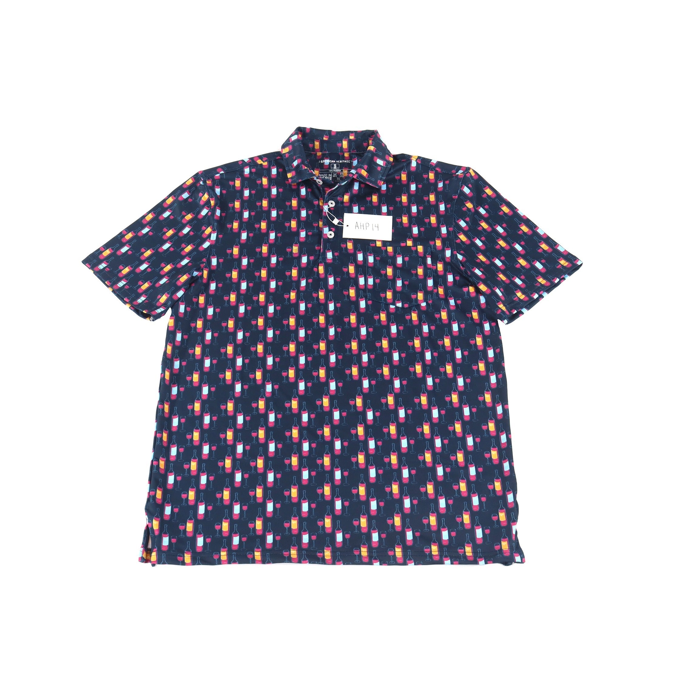 Short sleeve shirt in navy with wine bottle and glasses and one pocket.