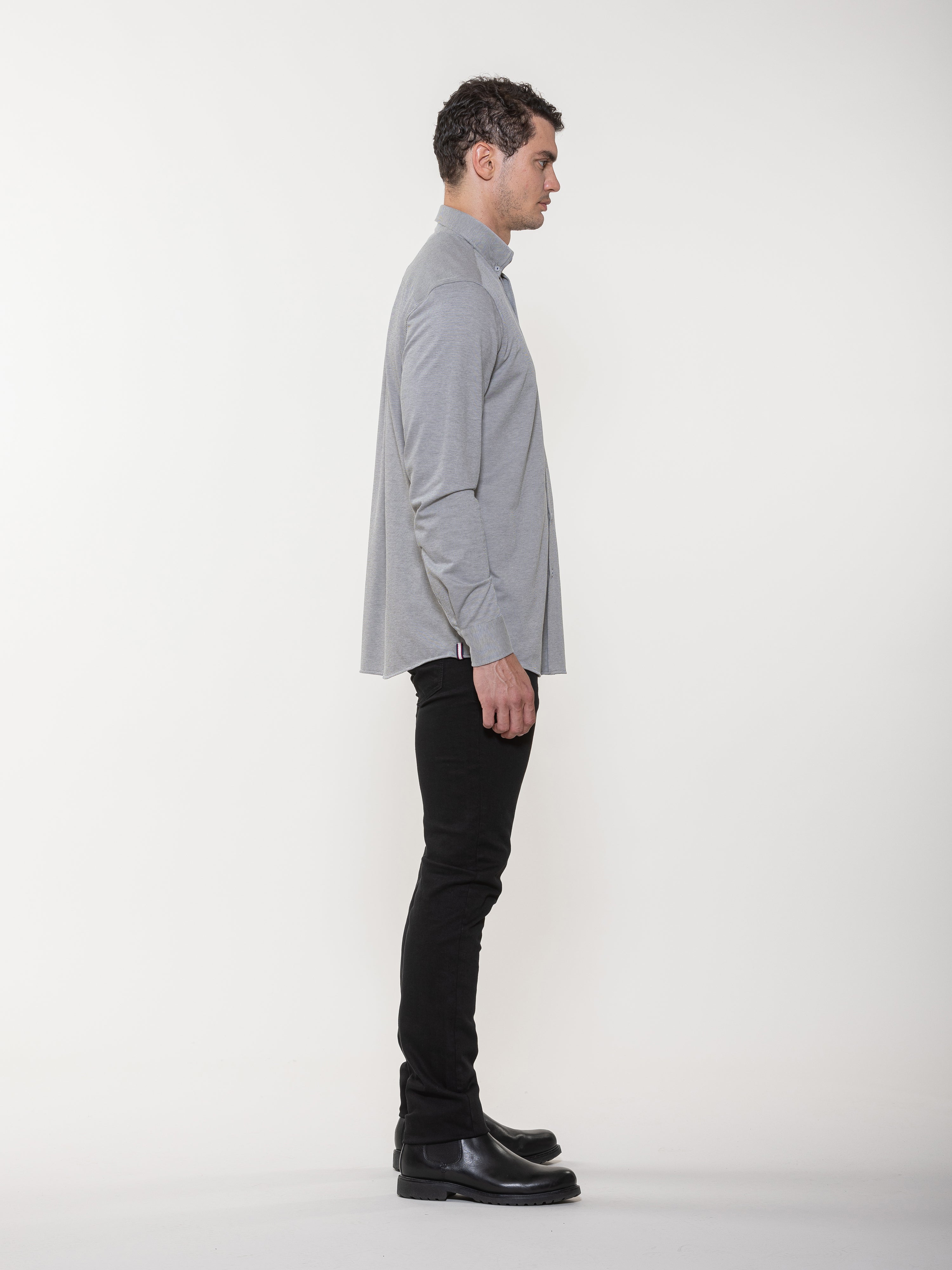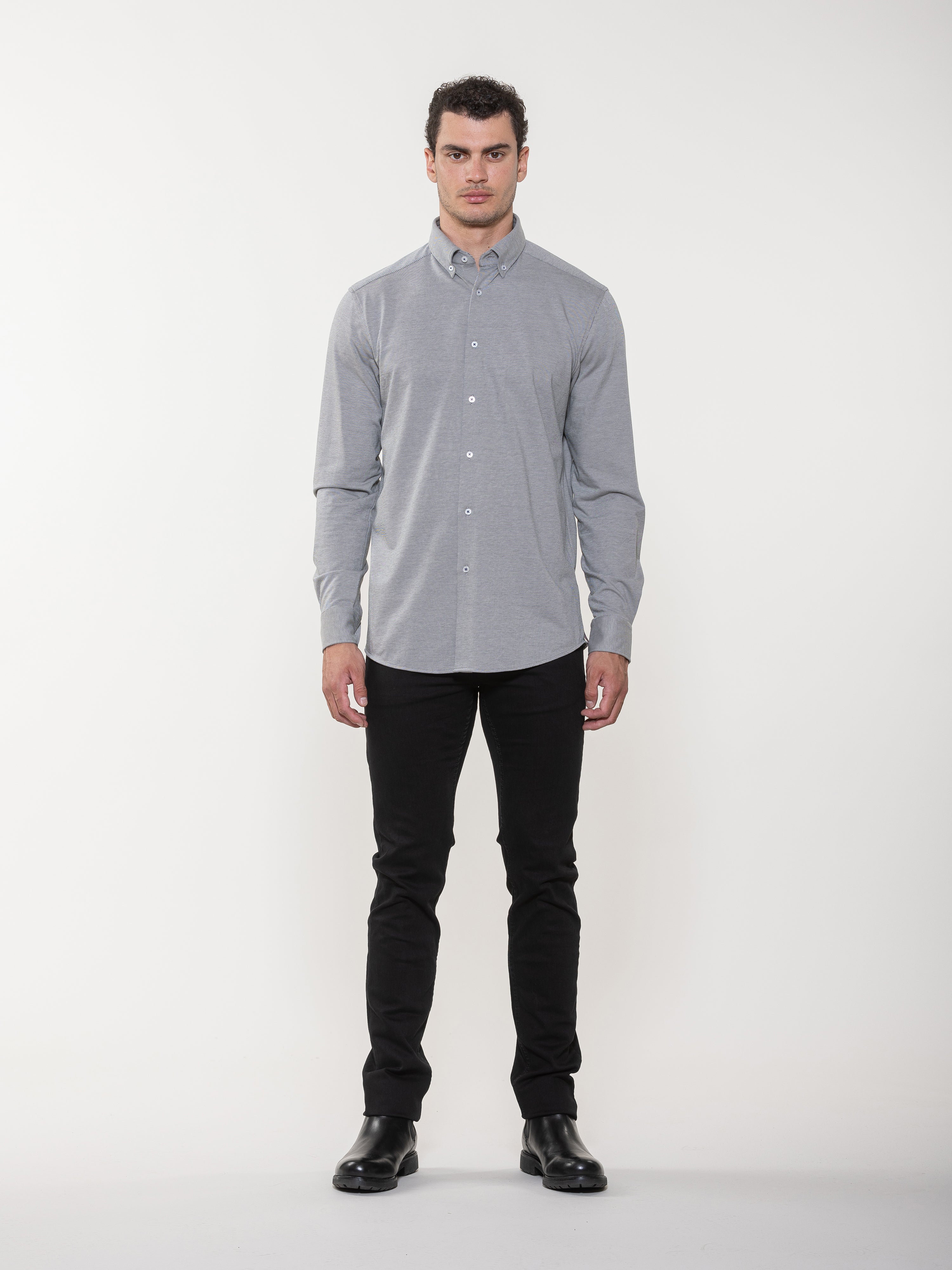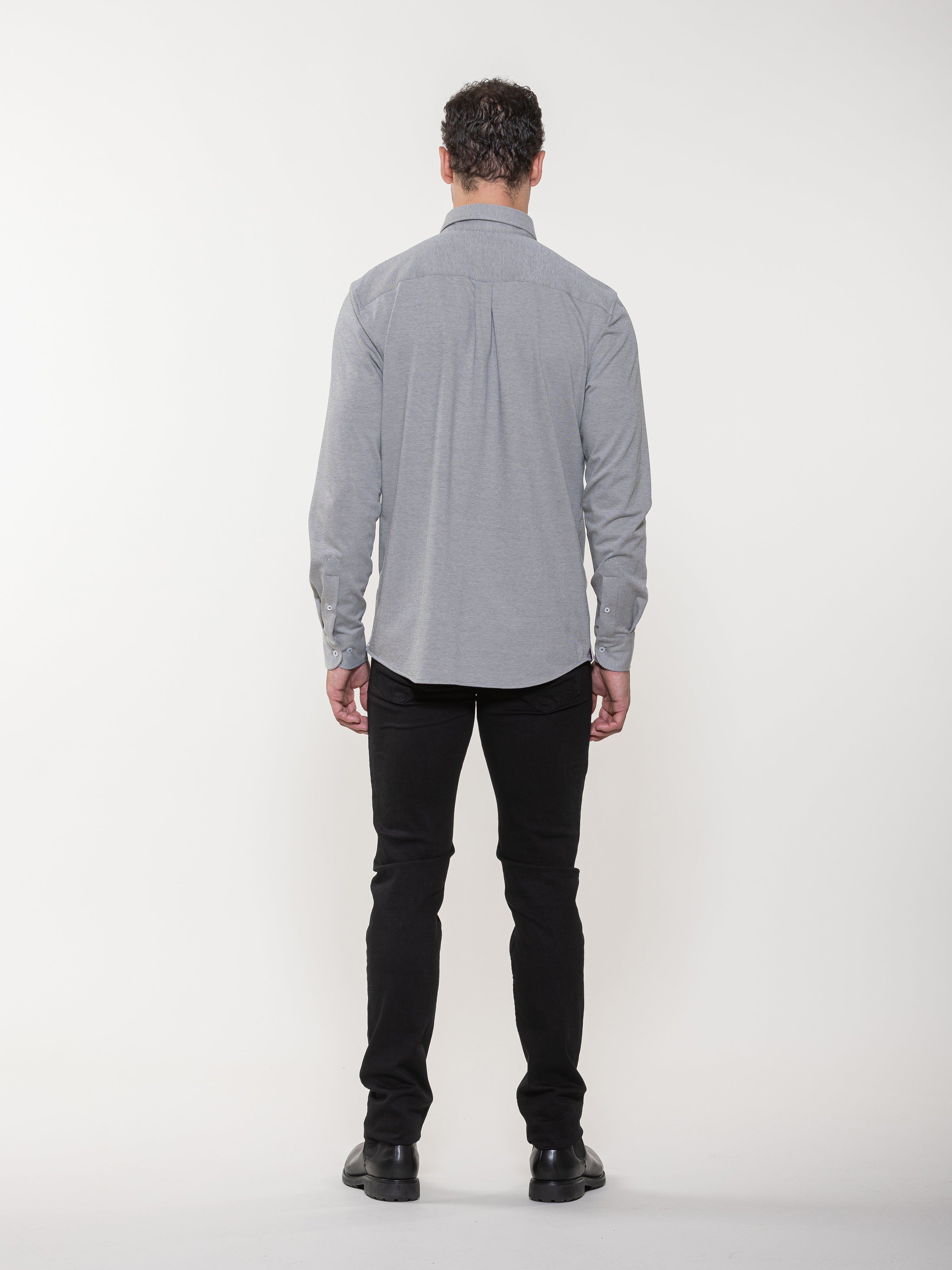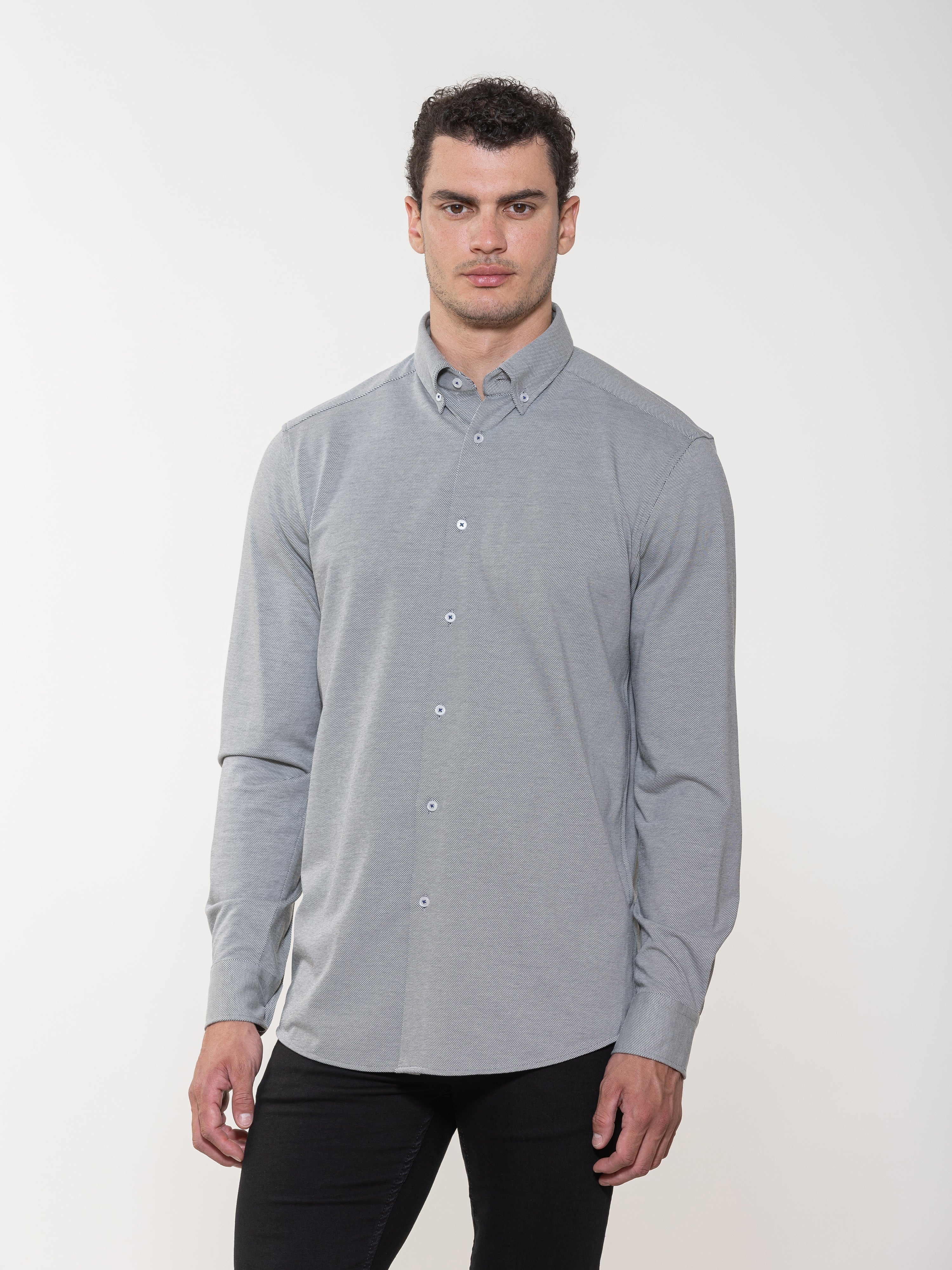 Grey Twill four-way stretch, fast dry, moisture-wicking, wrinkle-free, and easy care long sleeve knit performance shirt.