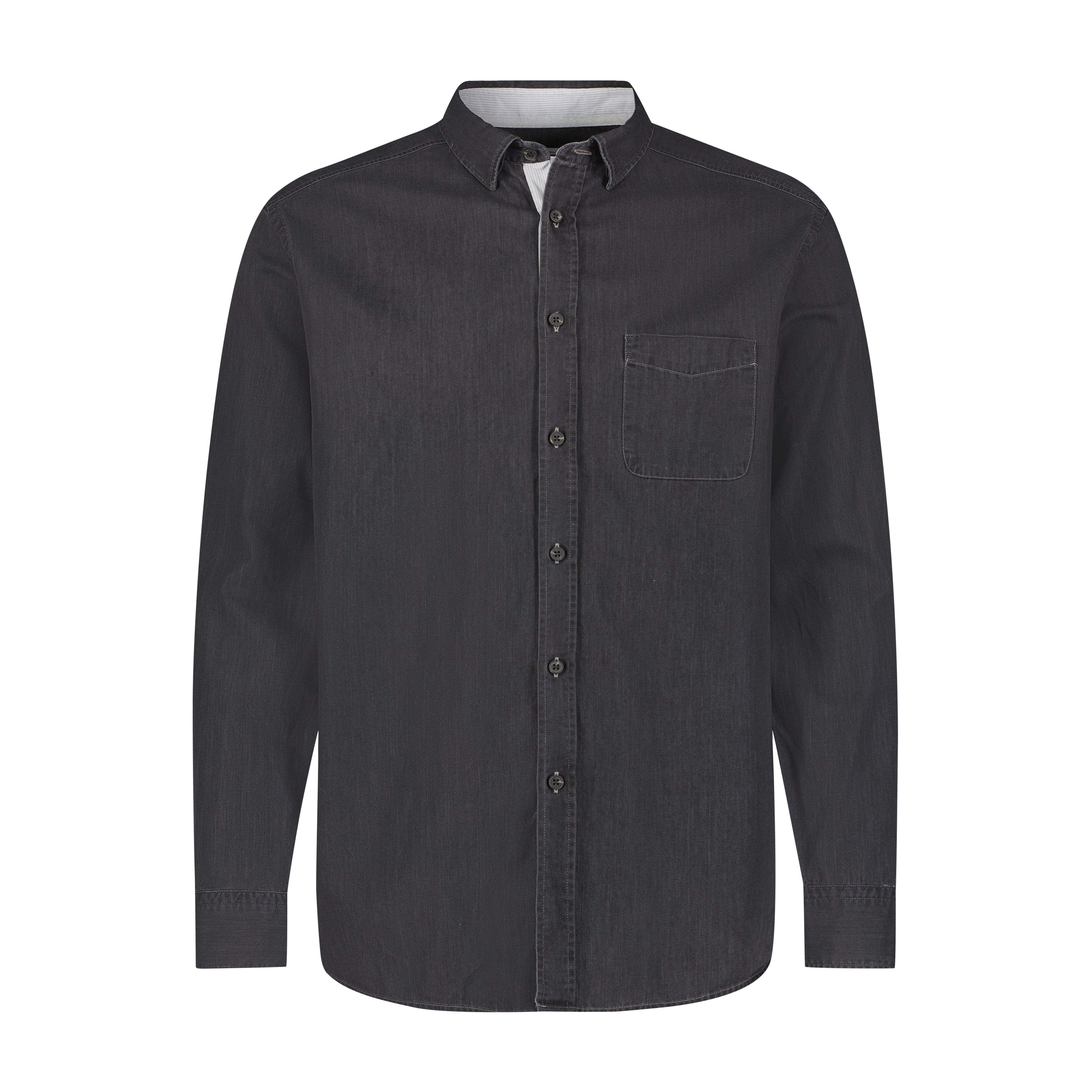 100% Cotton Tencel long sleeve single pocket woven shirt in charcoal with hidden button down & stripe tapering detail.